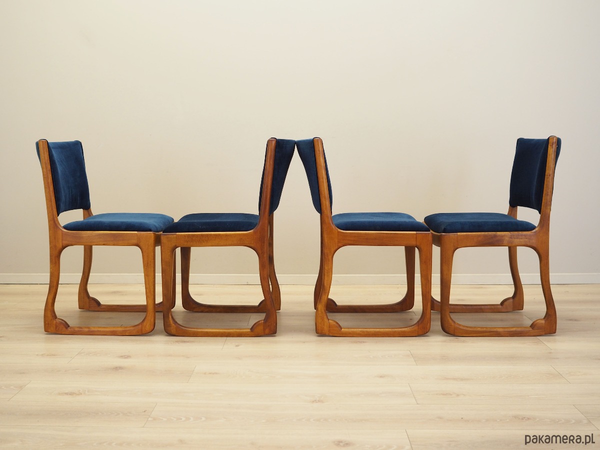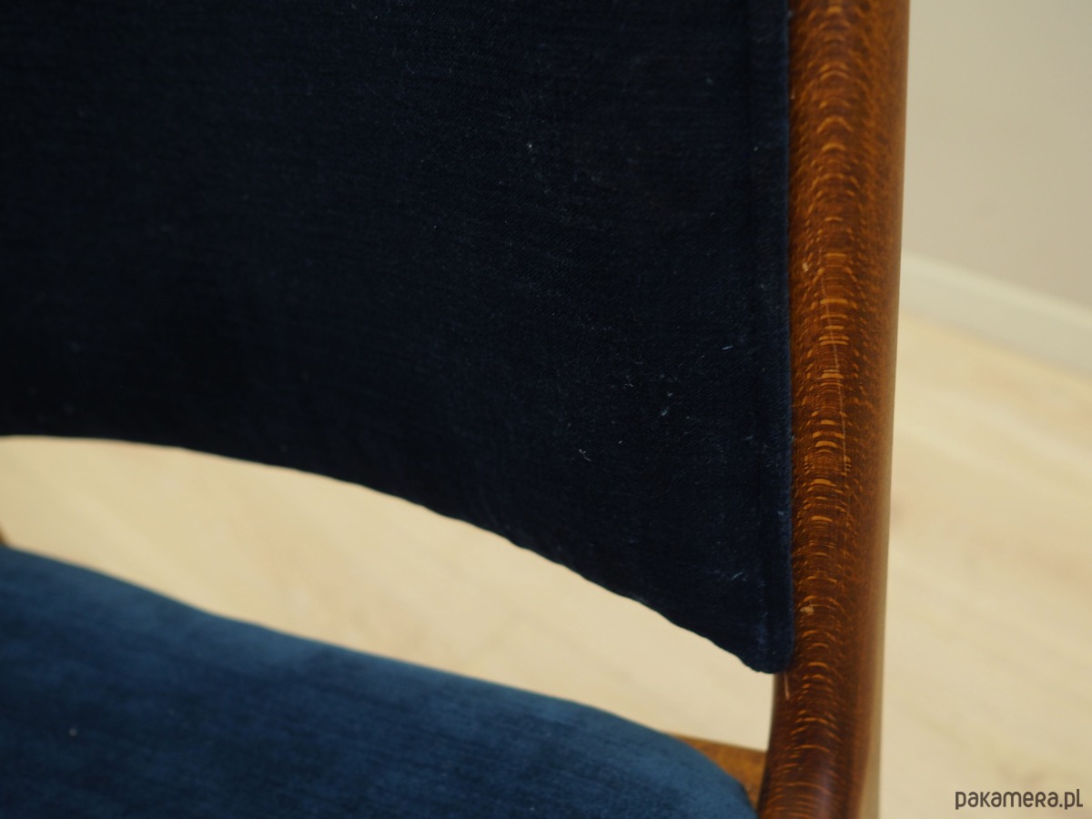 Konstrukcja wykonana jest z drewna bukowego. Drewno po odświeżeniu. Krzesła posiadają nową tapicerkę. Tapicerka została wykonana w kolorze granatowym, wykorzystana została wysokogatunkowa tkanina welurowa.
