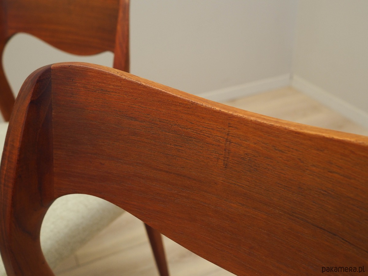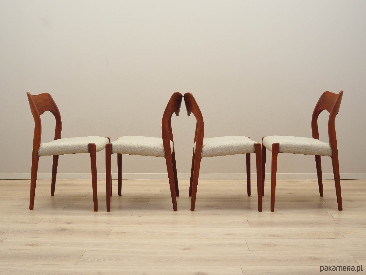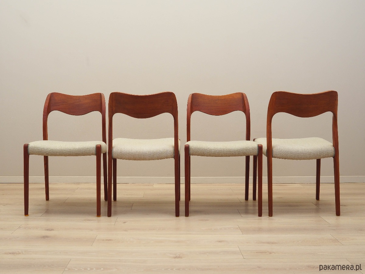 Komplet czterech krzeseł został wykonany w latach 60-tych, zaprojektowany przez czołowego duńskiego projektanta Niels'a Otto Møller'a. Model 71.