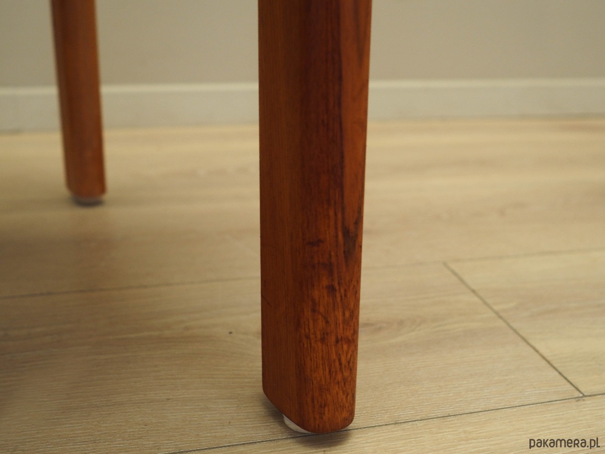 Konstrukcja wykonana jest z drewna tekowego. Drewno po odświeżeniu. Krzesła posiadają nową tapicerkę. Do renowacji użyto wysokiej jakości tkaniny.