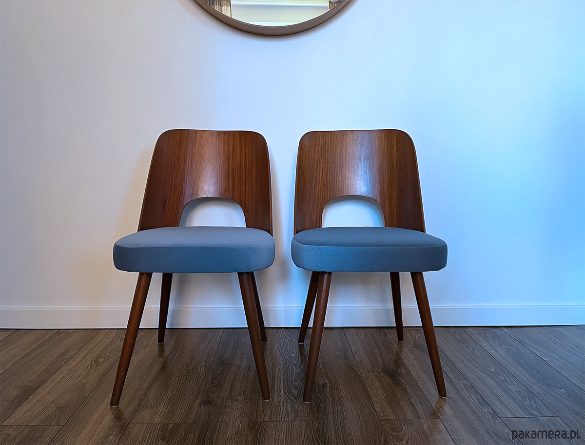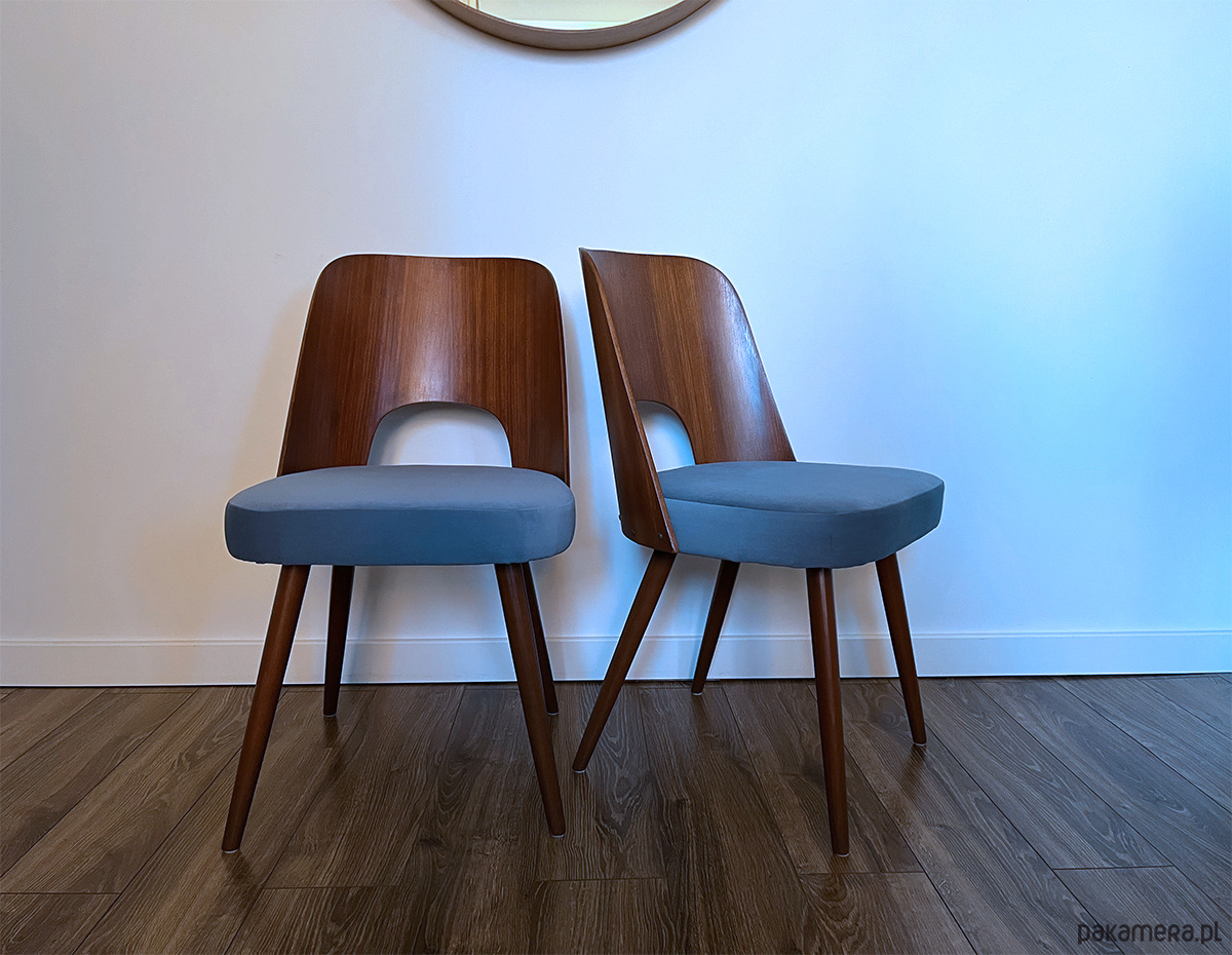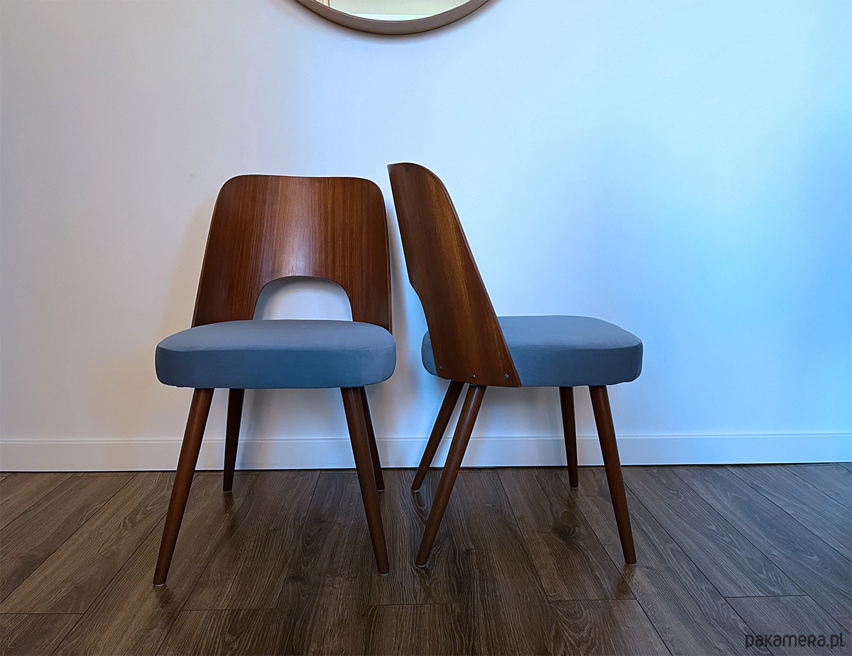 Komplet dwóch krzeseł z lat 60' projekt - Oswald Haerdtl dla Ton. Krzesła przeszły profesjonalną renowacja stolarsko-tapicerską. Nóżki krzeseł oraz oparcie zabezpieczone olejowoskami Osmo w kolorze jasnego orzecha. Siedzisko z nową gąbką tapicerską zostało obite wysokogatunkowym materiałem typu velvet w kolorze zgaszonego błękitu.