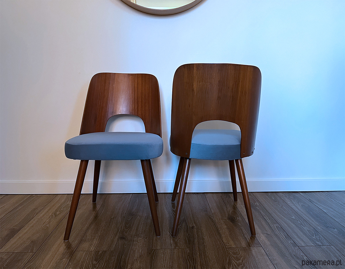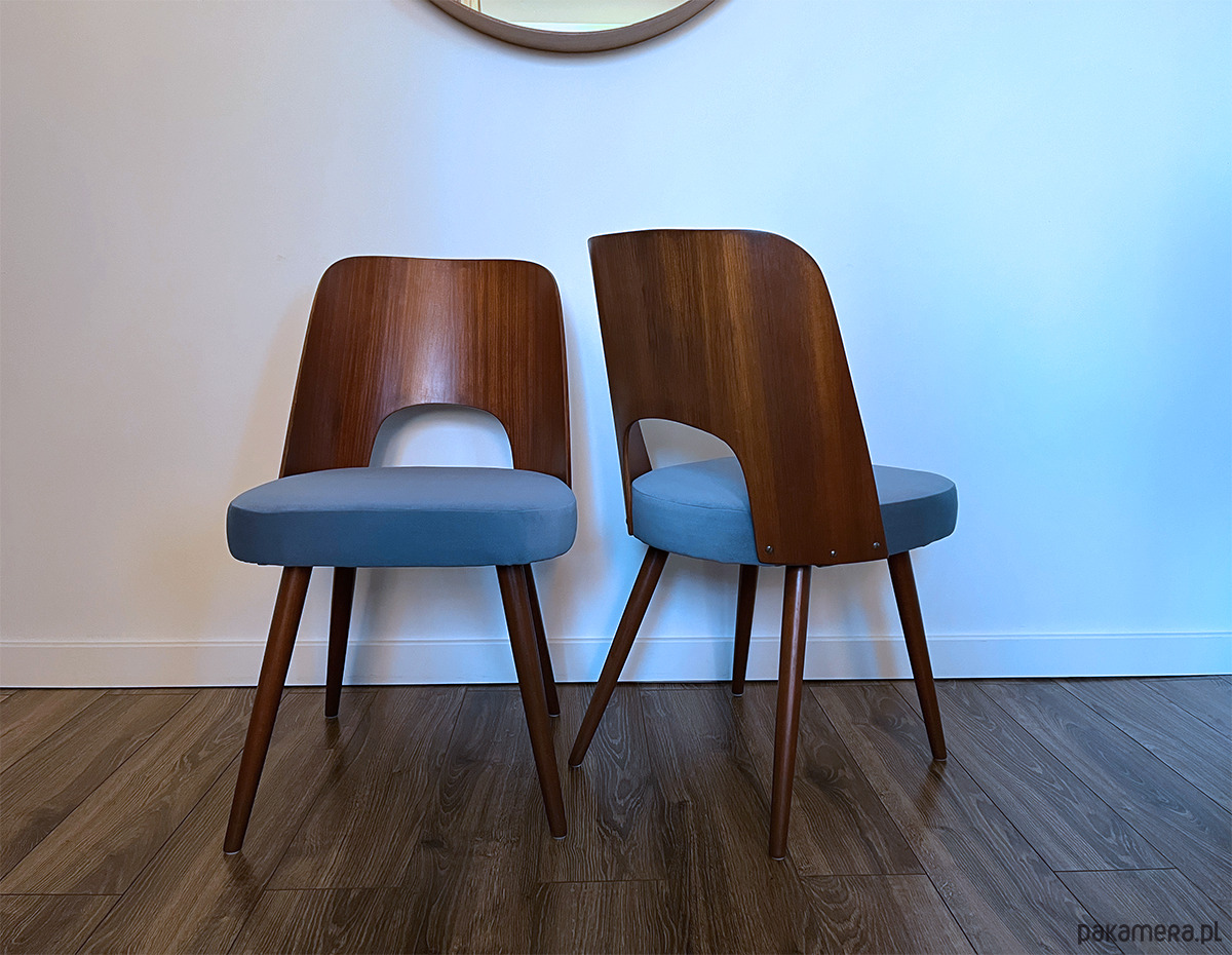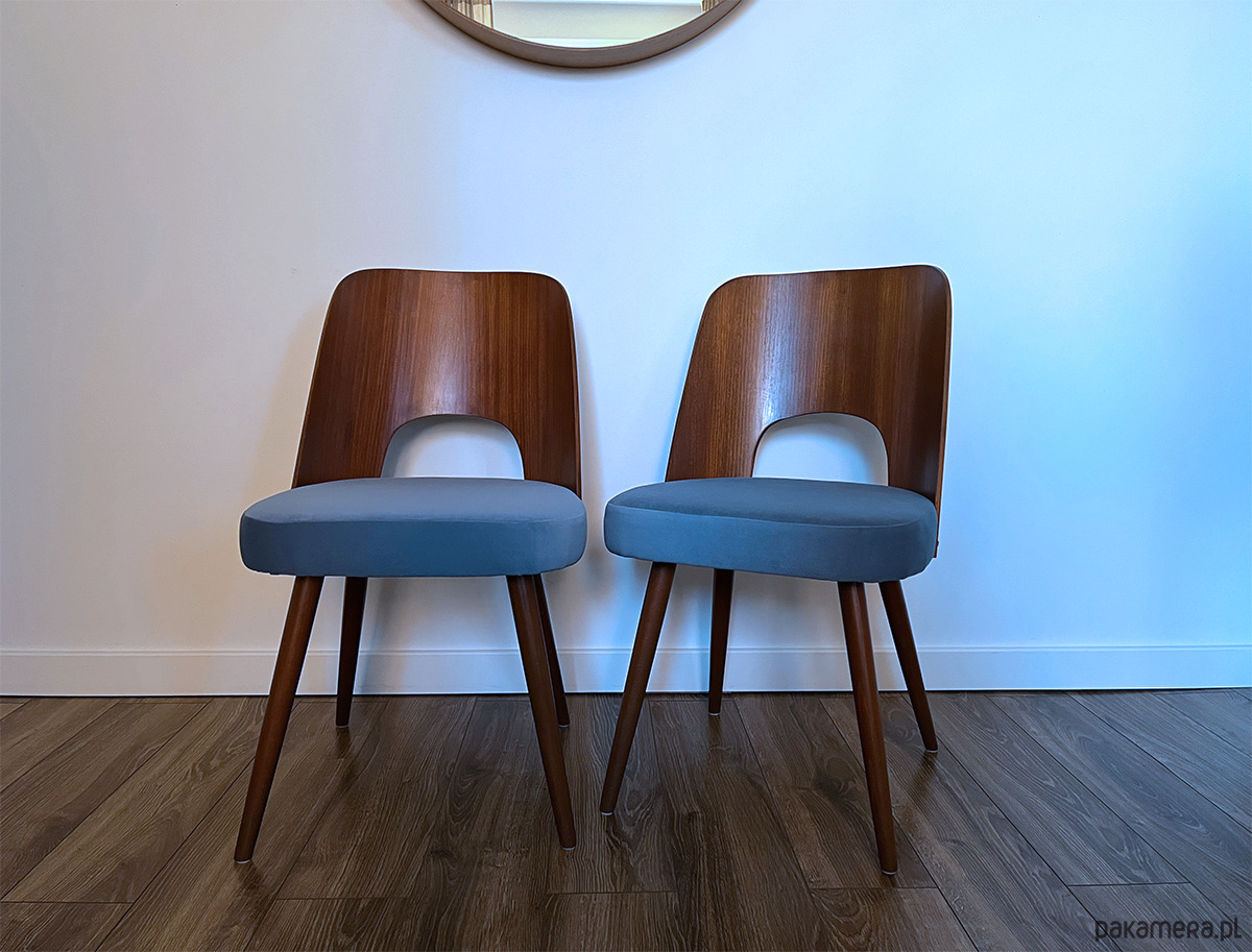 Komplet dwóch krzeseł z lat 60' projekt - Oswald Haerdtl dla Ton. Krzesła przeszły profesjonalną renowacja stolarsko-tapicerską. Nóżki krzeseł oraz oparcie zabezpieczone olejowoskami Osmo w kolorze jasnego orzecha. Siedzisko z nową gąbką tapicerską zostało obite wysokogatunkowym materiałem typu velvet w kolorze zgaszonego błękitu.