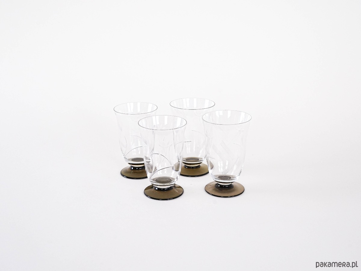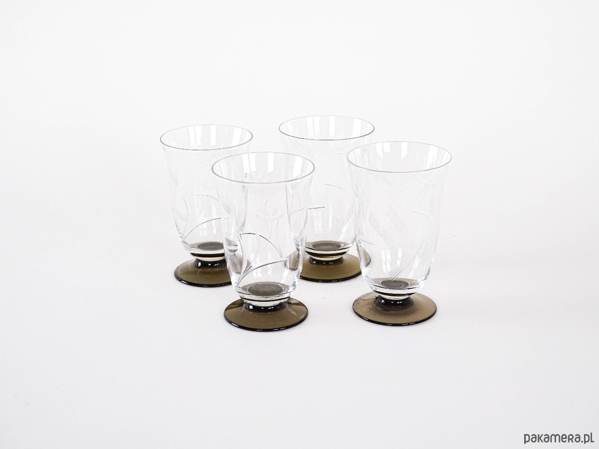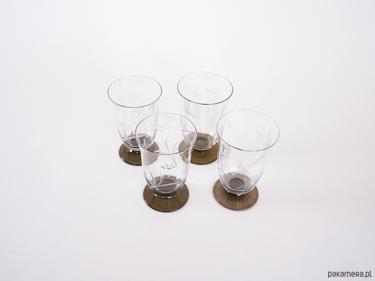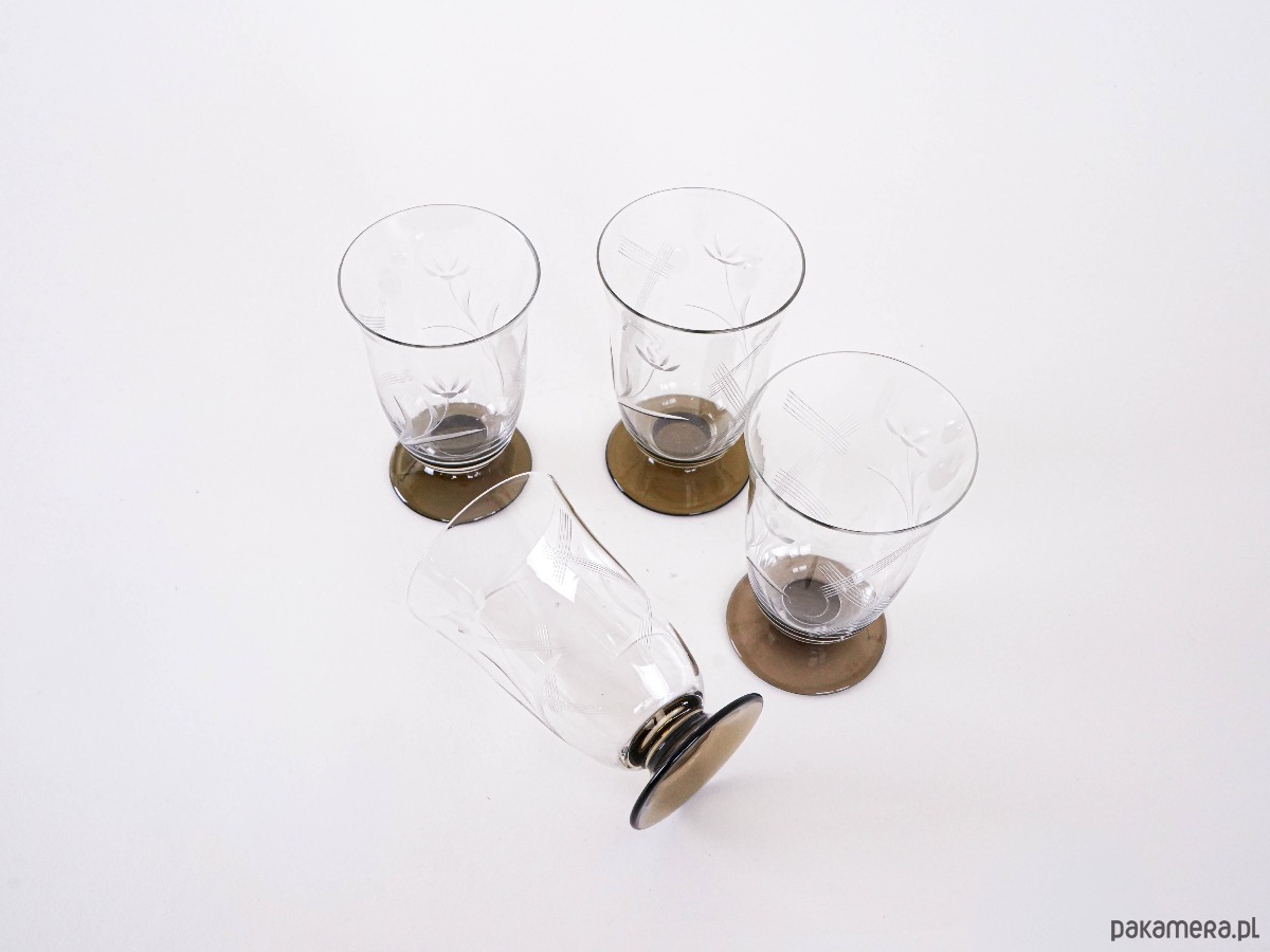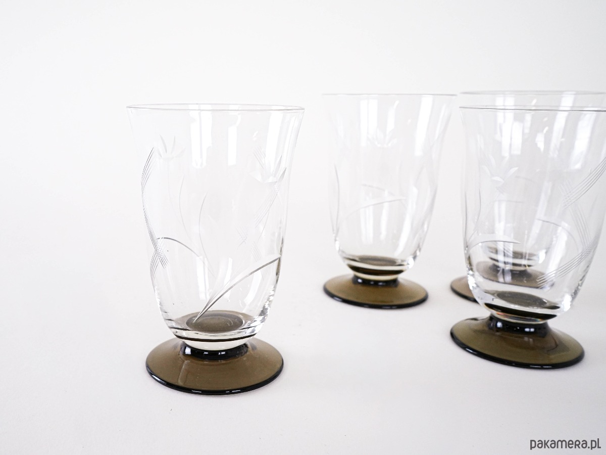 Komplet 4 szklanek vintage wykonanych ze szlifowanego szkła. Eleganckie zdobienia w formie grawerowanego motywu roślinnego oraz kontrastowe, ciemne podstawy nadają im wyjątkowego charakteru. Idealne do serwowania napojów w stylu retro.