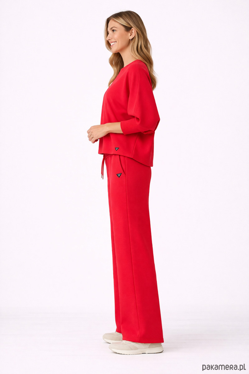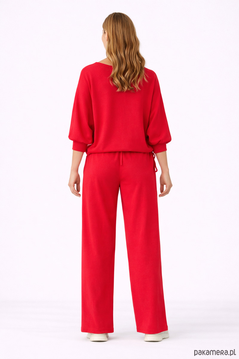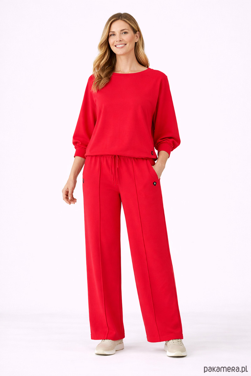 Wykonany z wysokiej jakości, miękkiej dzianiny, zapewnia maksymalny komfort i swobodę ruchu przez cały dzień. Oversize’owa bluza z rękawem 3/4 delikatnie układa się na sylwetce wiązana w pasie troczkiem , a spodnie o luźnym kroju z prostą nogawką i kantem optycznie wydłużają nogi i nadają całości bardziej eleganckiego charakteru.