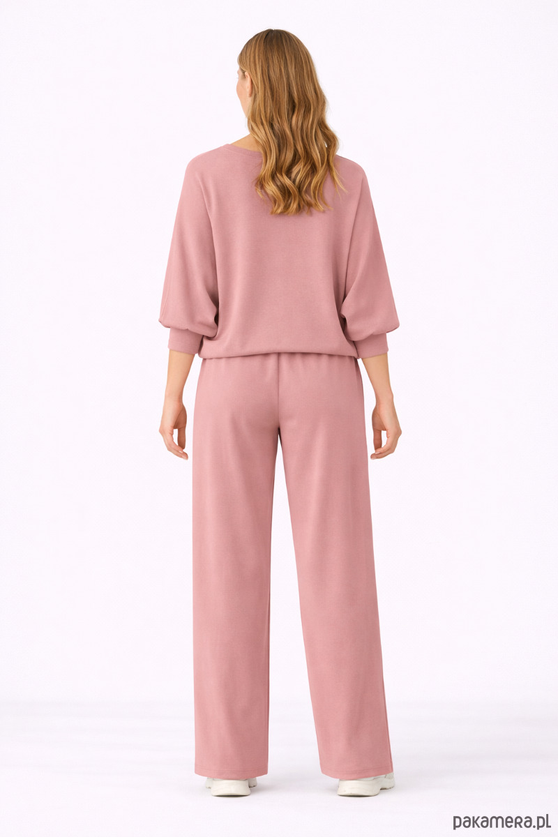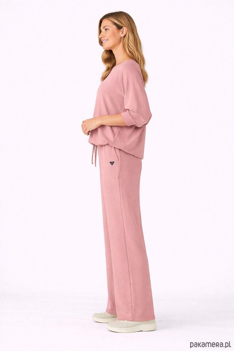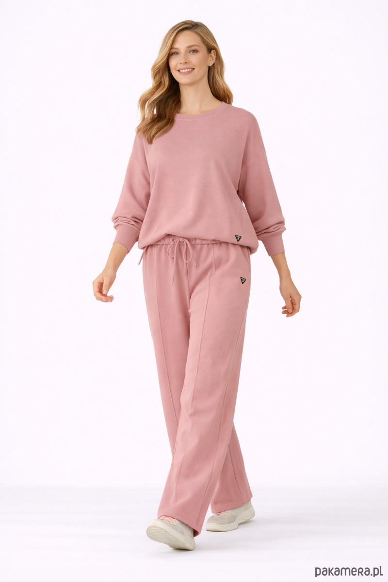 Wykonany z wysokiej jakości, miękkiej dzianiny, zapewnia maksymalny komfort i swobodę ruchu przez cały dzień. Oversize’owa bluza z rękawem 3/4 delikatnie układa się na sylwetce wiązana w pasie troczkiem , a spodnie o luźnym kroju z prostą nogawką i kantem optycznie wydłużają nogi i nadają całości bardziej eleganckiego charakteru.