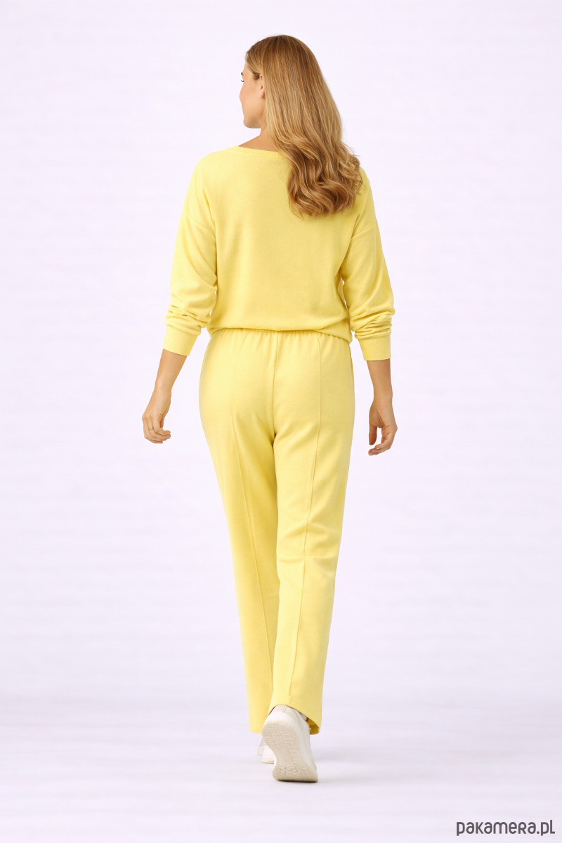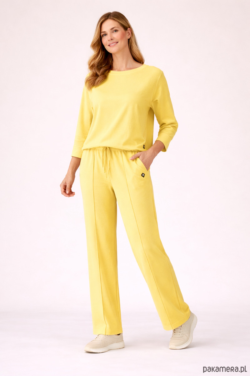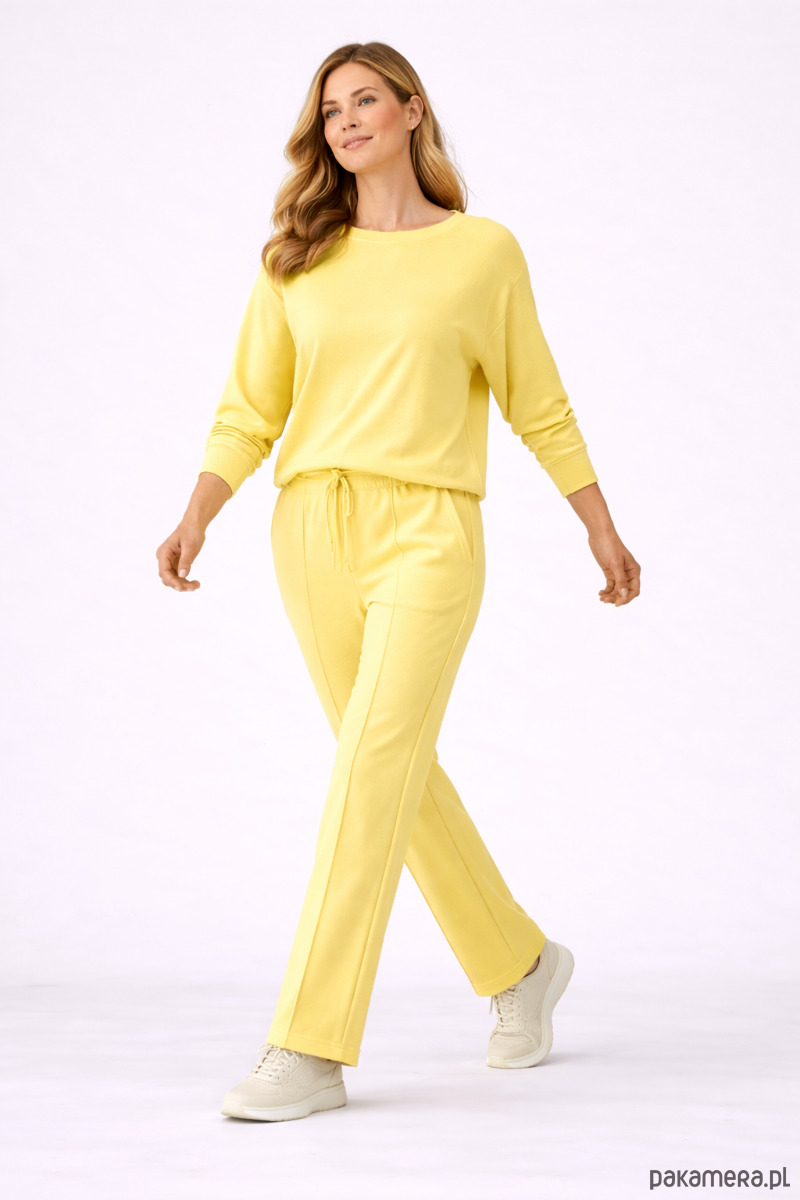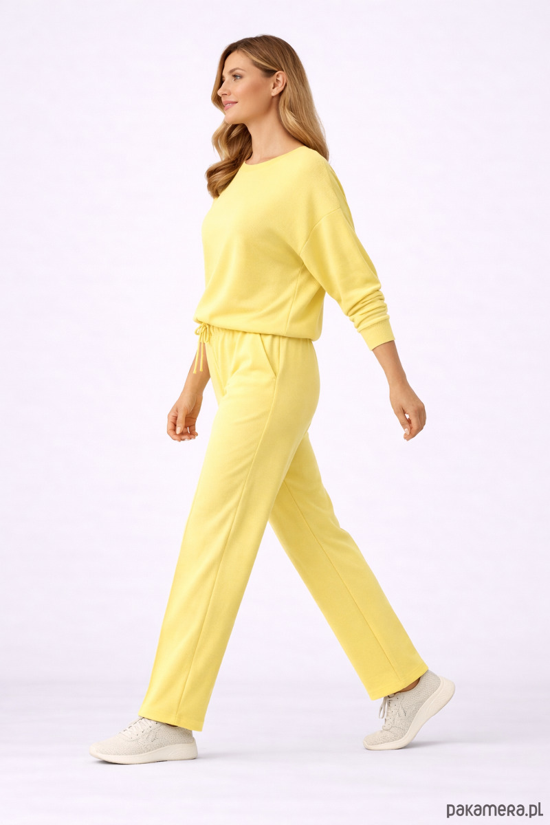 Wykonany z wysokiej jakości, miękkiej dzianiny, zapewnia maksymalny komfort i swobodę ruchu przez cały dzień. Oversize’owa bluza z rękawem 3/4 delikatnie układa się na sylwetce wiązana w pasie troczkiem , a spodnie o luźnym kroju z prostą nogawką i kantem optycznie wydłużają nogi i nadają całości bardziej eleganckiego charakteru.
