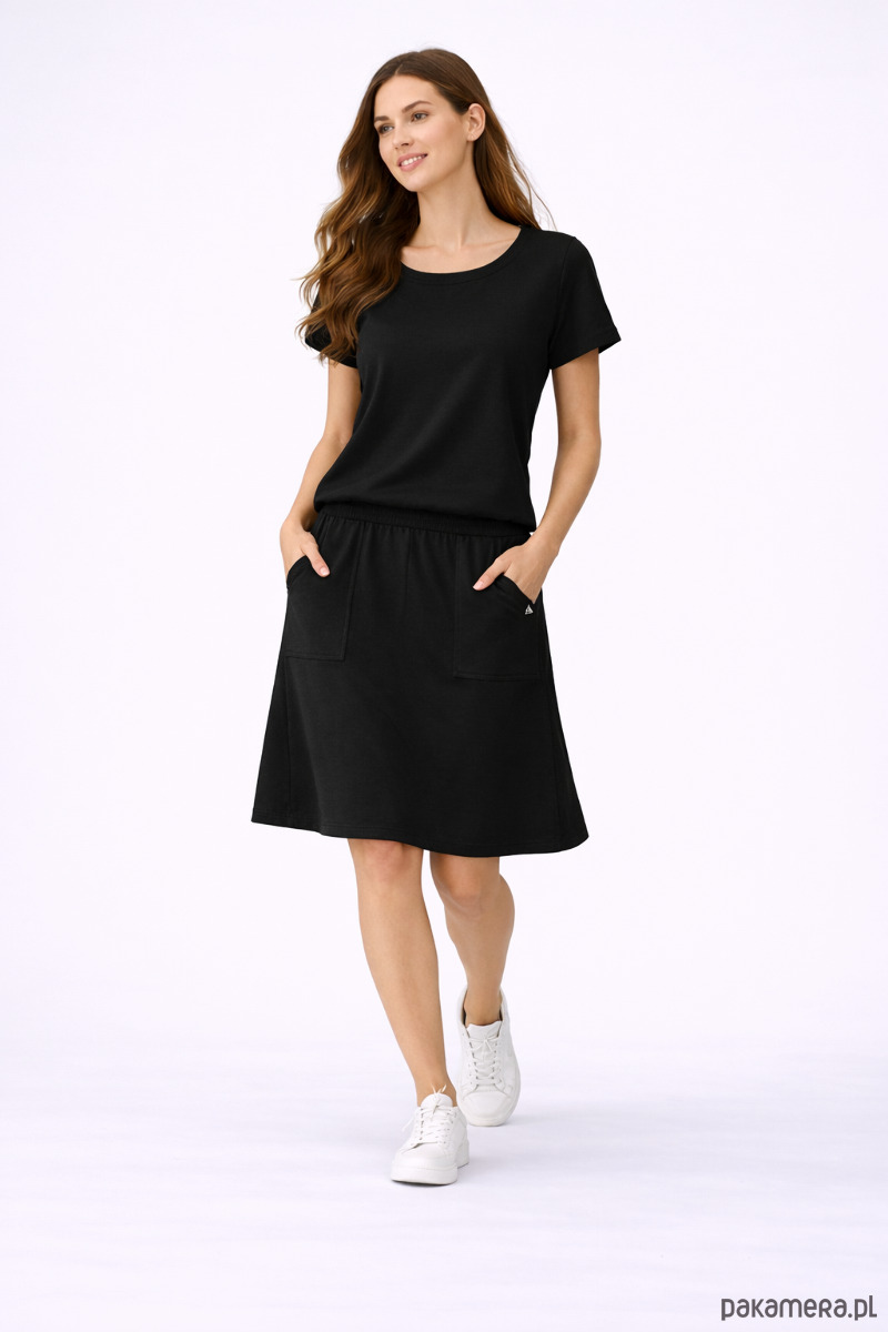 Spódnica posiada wysoki stan z prążkowanym ściągaczem, który dobrze trzyma talię, ale nie uciska. Dodatkowo duże kieszenie z przodu nadają całości nowoczesnego, lekko streetowego charakteru.
