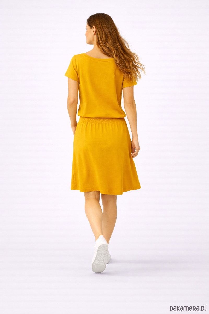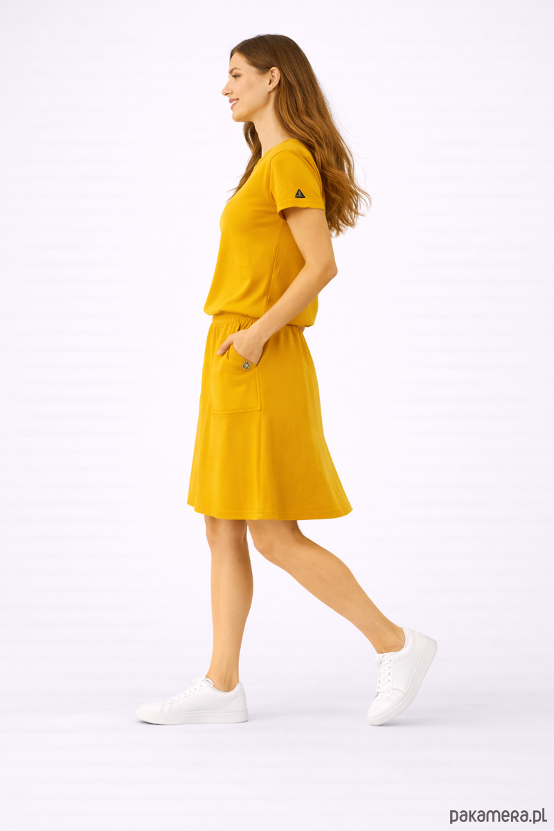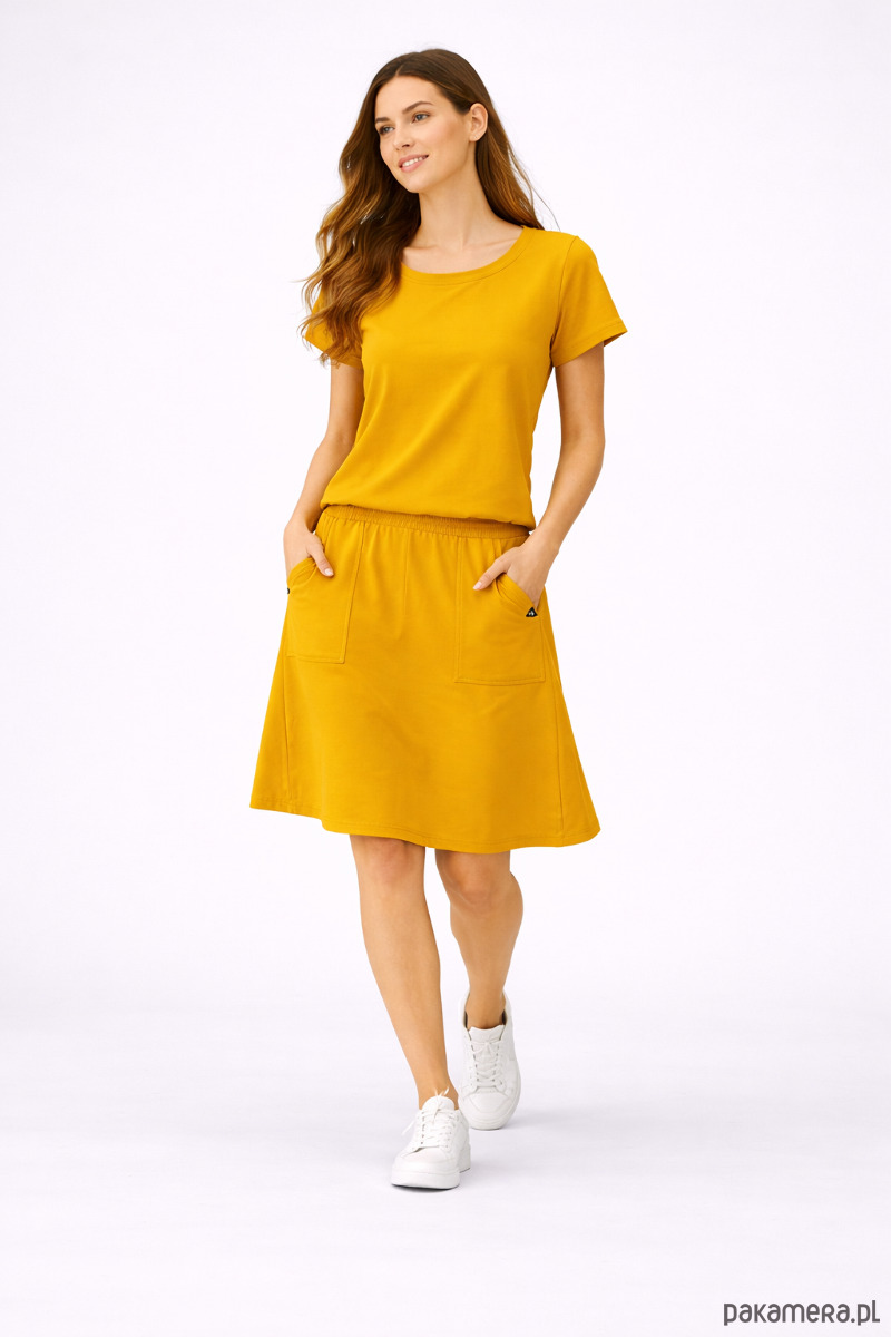 Spódnica posiada wysoki stan z prążkowanym ściągaczem, który dobrze trzyma talię, ale nie uciska. Dodatkowo duże kieszenie z przodu nadają całości nowoczesnego, lekko streetowego charakteru.