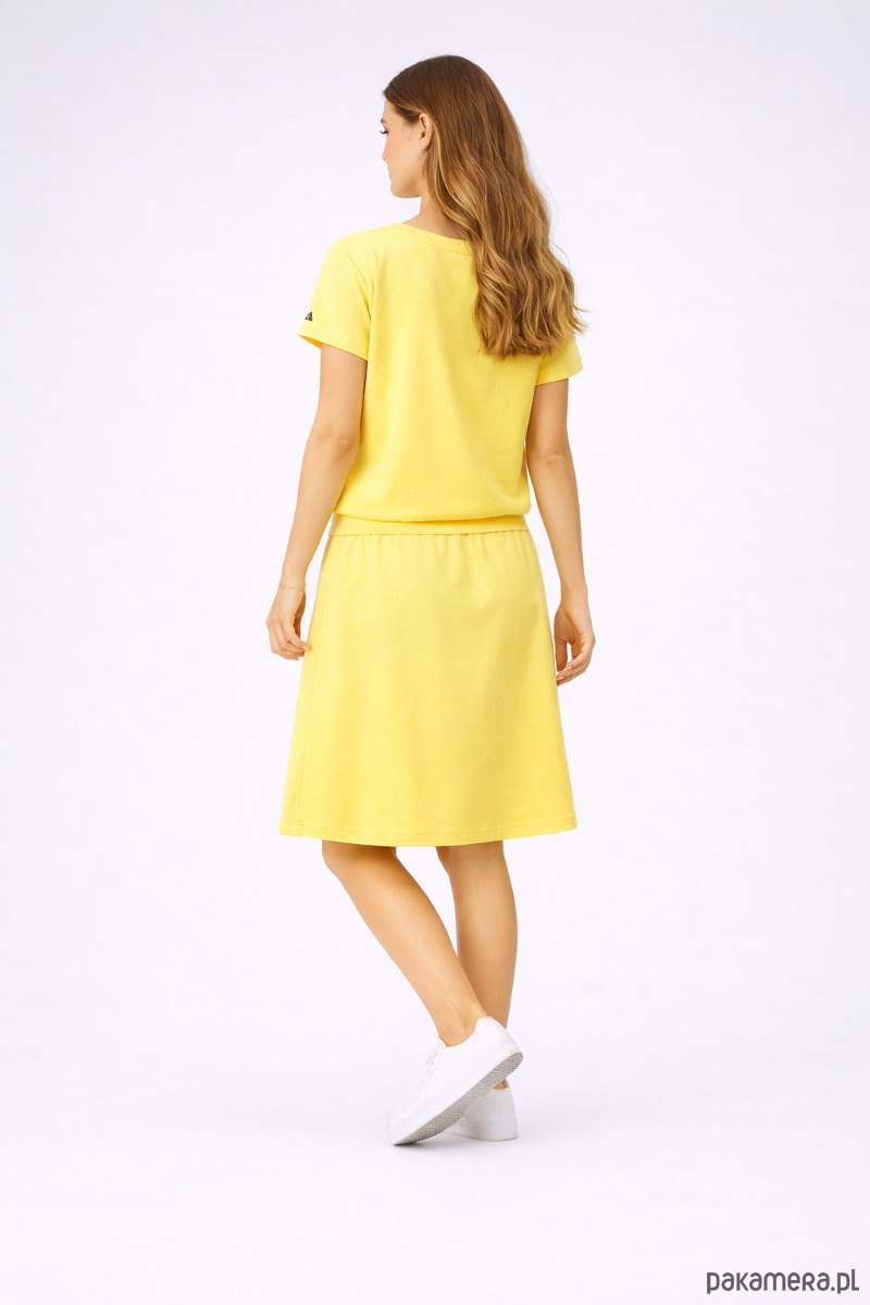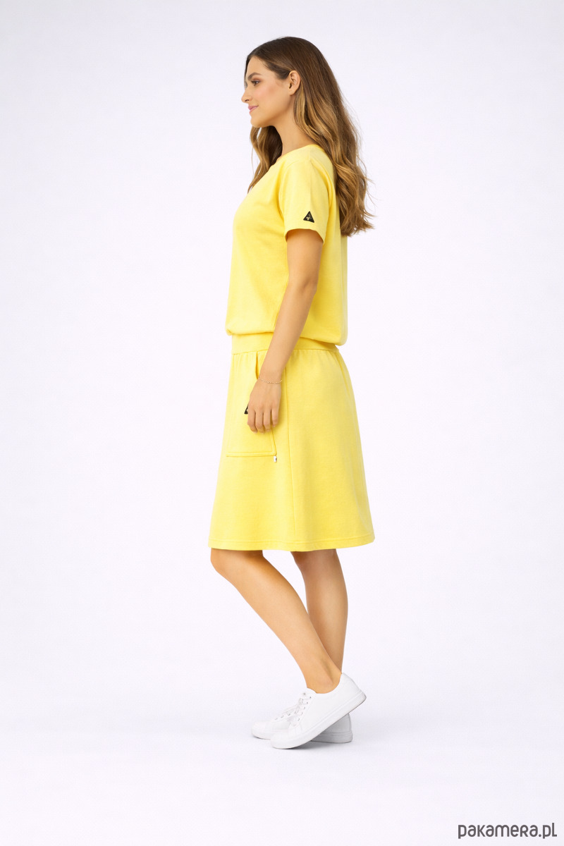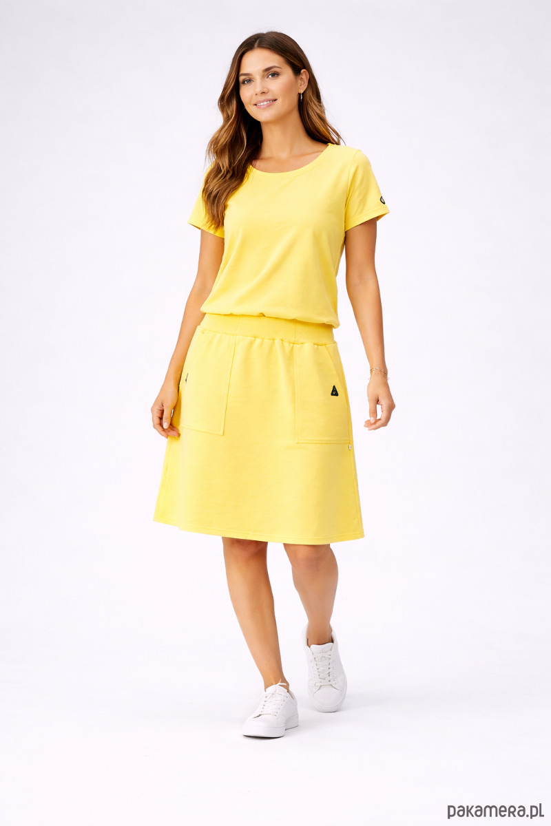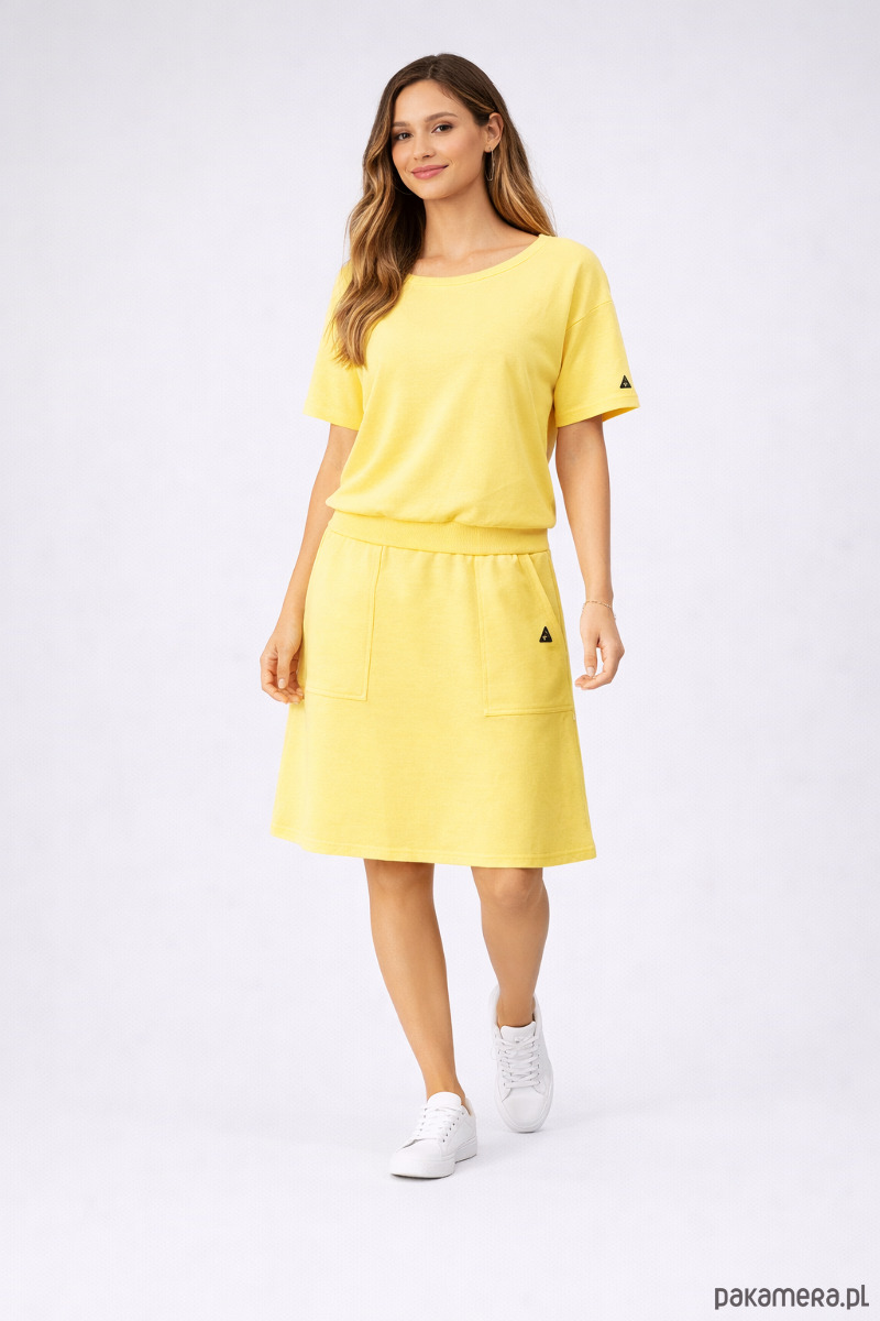 Spódnica posiada wysoki stan z prążkowanym ściągaczem, który dobrze trzyma talię, ale nie uciska. Dodatkowo duże kieszenie z przodu nadają całości nowoczesnego, lekko streetowego charakteru.