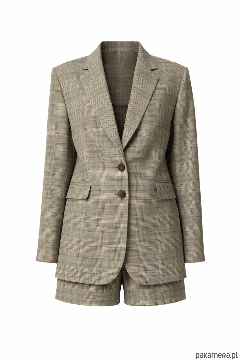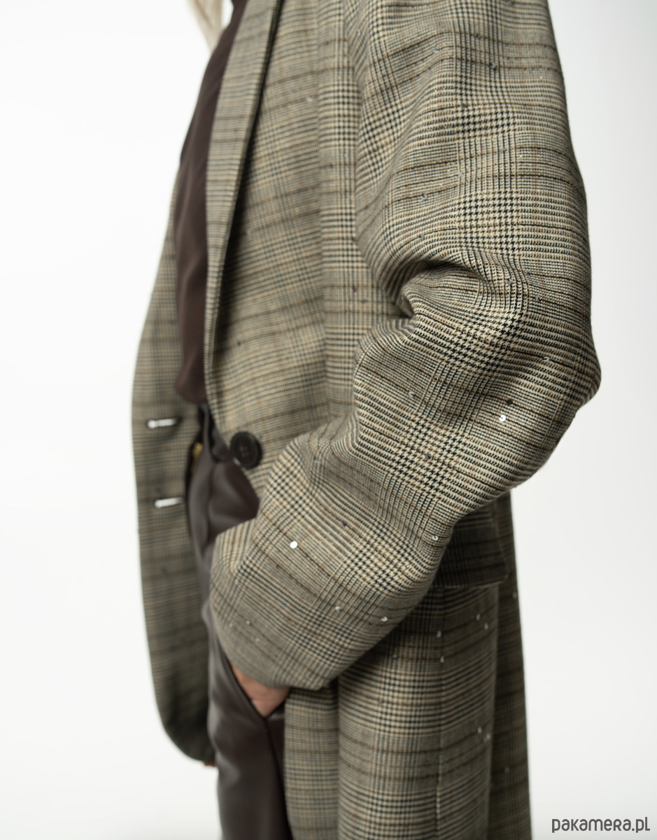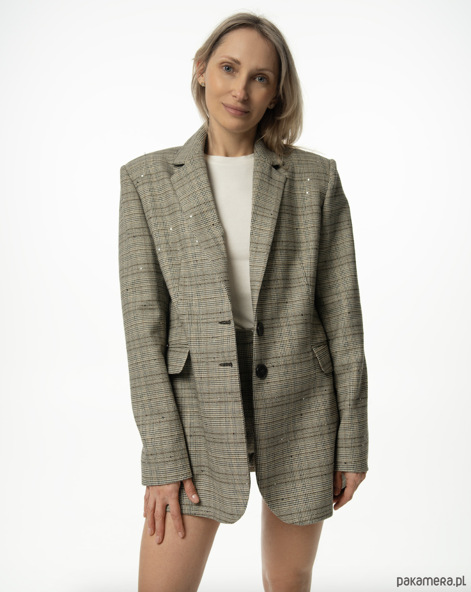 Komplet Urban Sparkle łączy nowoczesną elegancję z miejskim szykiem. Wydłużona marynarka i krótkie szorty w modną kratę tworzą spójną, wyrazistą stylizację. Taliowana marynarka zachwyca klasycznym krojem oraz starannym wykończeniem. Subtelna krata z drobnymi cekinami delikatnie połyskuje w ruchu i dodaje wyjątkowego charakteru. Dwa guziki oraz kieszenie z klapkami podkreślają ponadczasowy styl i elegancką linię sylwetki. Komplet Urban Sparkle to idealny wybór dla kobiet ceniących klasę, komfort i modny detal.
