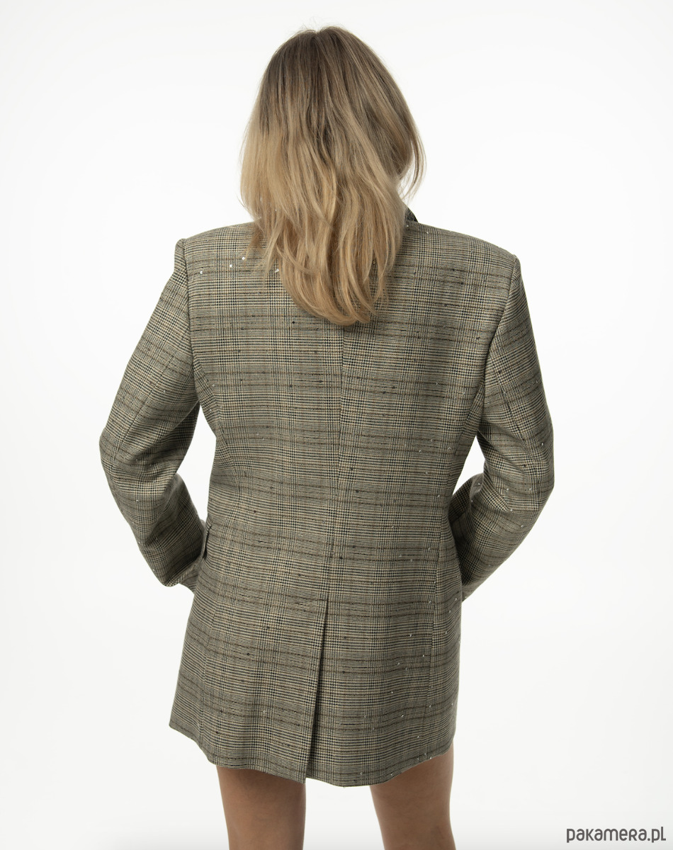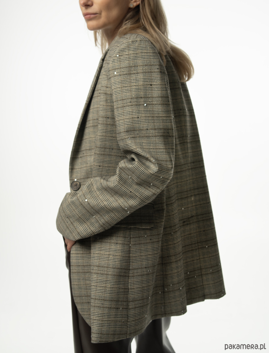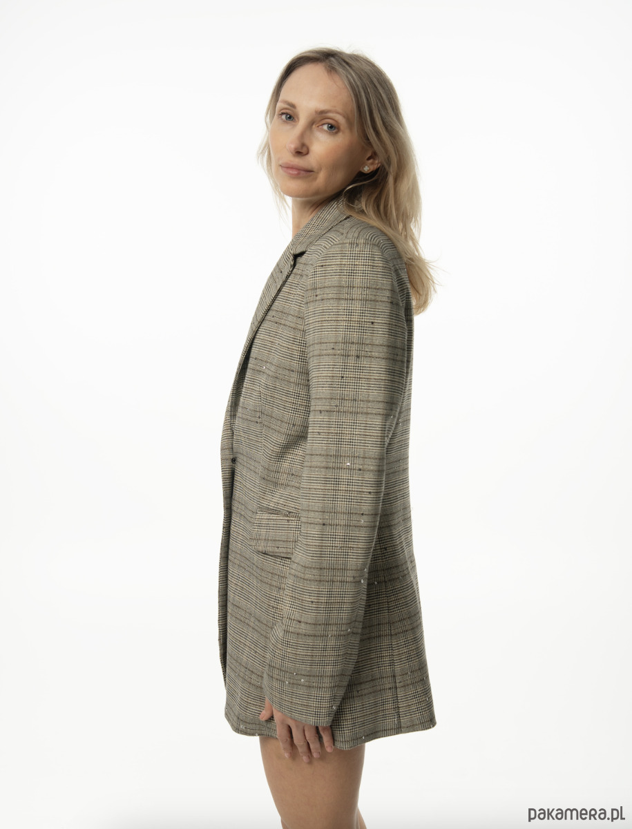 Komplet Urban Sparkle łączy nowoczesną elegancję z miejskim szykiem. Wydłużona marynarka i krótkie szorty w modną kratę tworzą spójną, wyrazistą stylizację. Taliowana marynarka zachwyca klasycznym krojem oraz starannym wykończeniem. Subtelna krata z drobnymi cekinami delikatnie połyskuje w ruchu i dodaje wyjątkowego charakteru. Dwa guziki oraz kieszenie z klapkami podkreślają ponadczasowy styl i elegancką linię sylwetki. Komplet Urban Sparkle to idealny wybór dla kobiet ceniących klasę, komfort i modny detal.