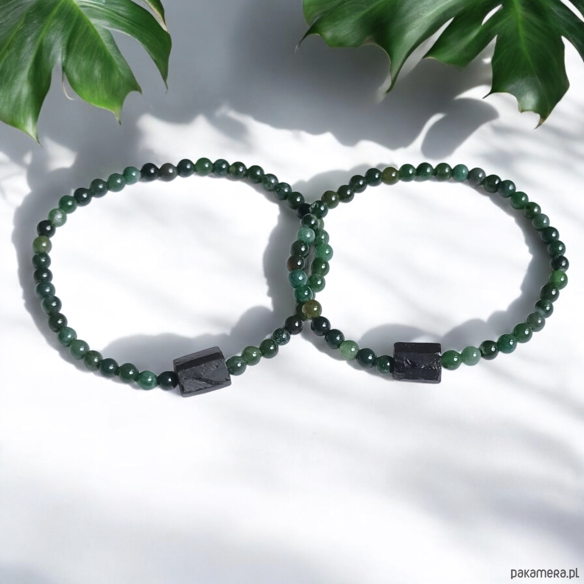 2x delikatna niezwykle ciekawa bransoletka- talizman wykonana z agatu mszystego w odcieniach zieleni (kuleczki 4mm) i niewielkiej, surowej bryłki czarnego turmalinu (ok.8mm)
