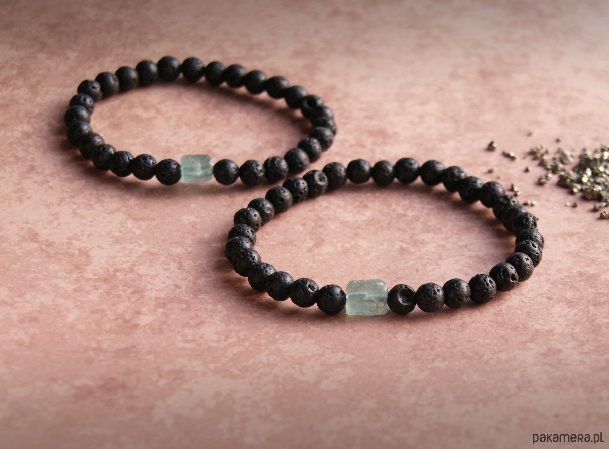 2x delikatna niezwykle ciekawa bransoletka- talizman wykonana z kuleczek porowatej lawy wulkanicznej (6mm) oraz nieregularnych, surowych bryłek błękitnego APATYTU.