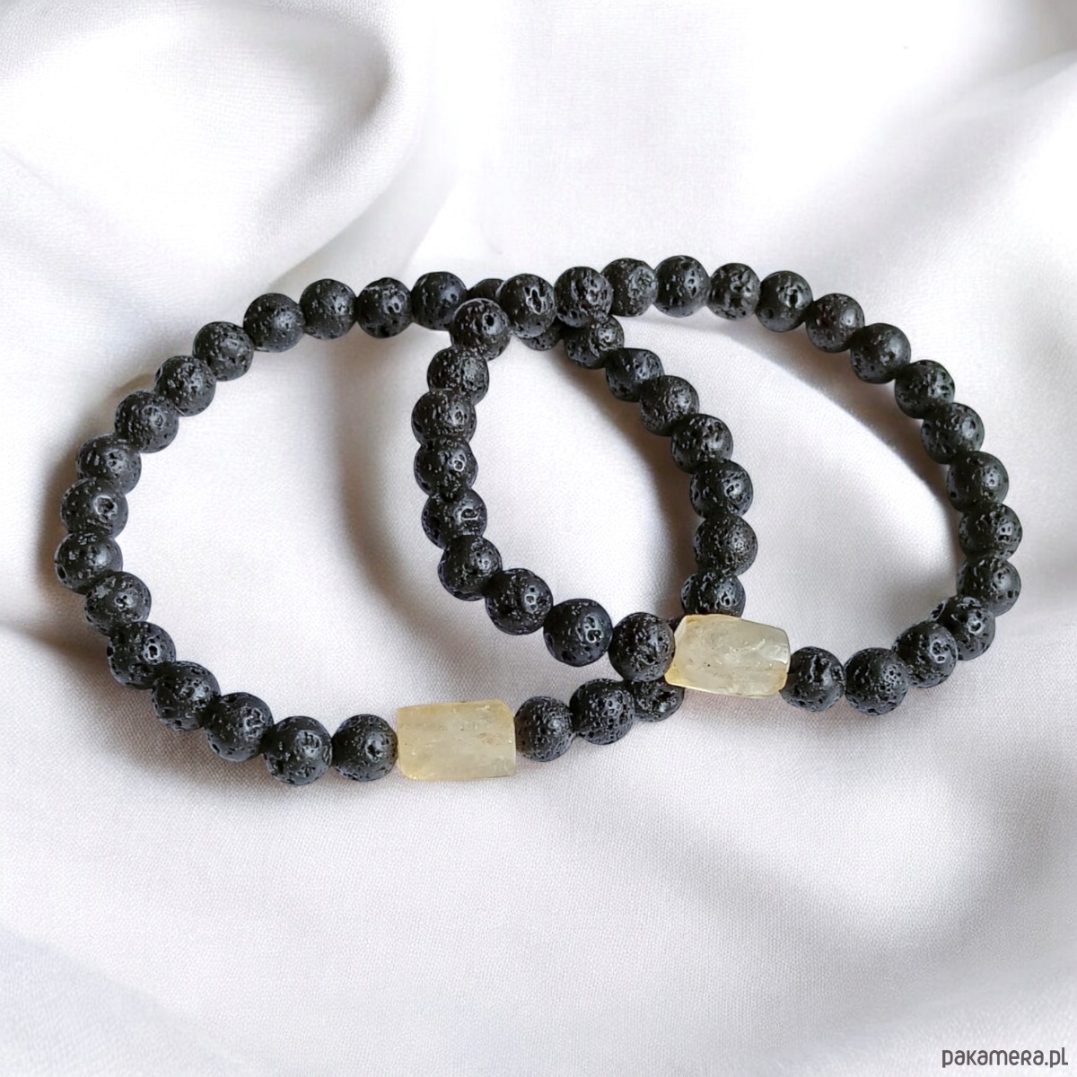 TUTAJ: 2xprosta, lecz ciekawa bransoletka wykonana z kul porowatej lawy wulkanicznej 6mm, z polerowaną, nieregularną bryłką cytrynu ok. 10mm.