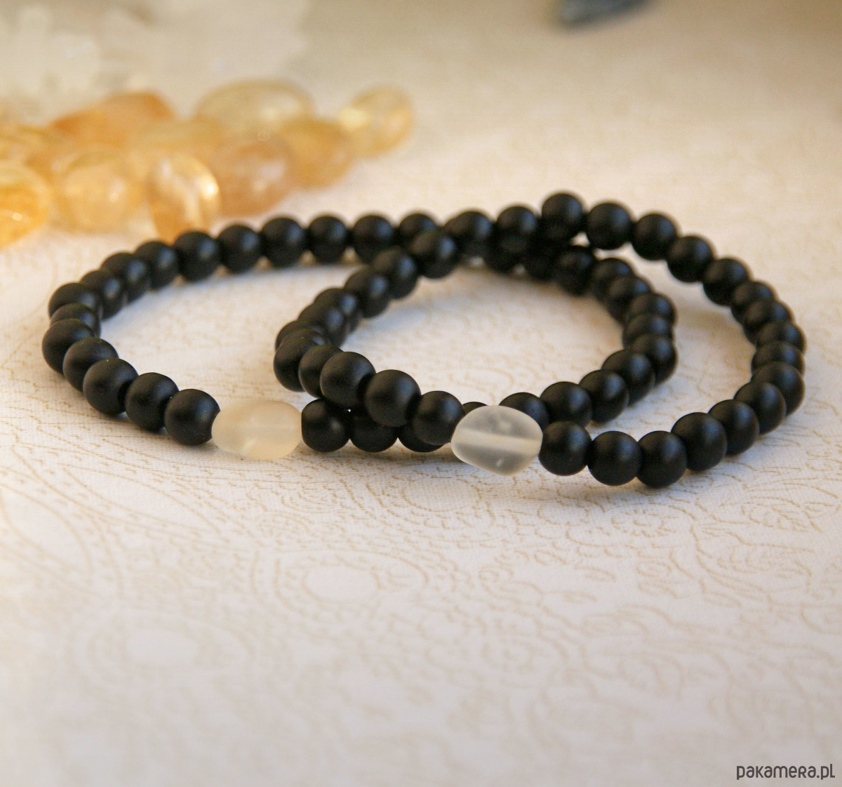 2x delikatna niezwykle ciekawa bransoletka- talizman wykonana z kuleczek matowego onyksu (6mm) oraz matowych, bryłek cytrynu (ok. 10mm) .
