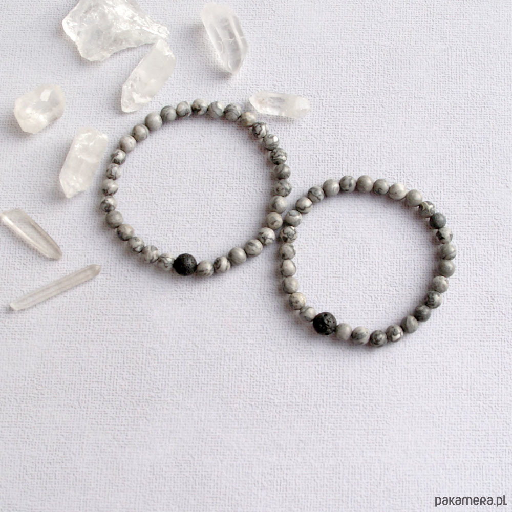 2x delikatna niezwykle ciekawa bransoletka- talizman wykonana z kuleczek szarego jaspisu koronkowego (6mm) i porowatej lawy wulkanicznej (kuleczki 8mm). na solidnej gumce jubilerskiej. bez elementów metalowych.
