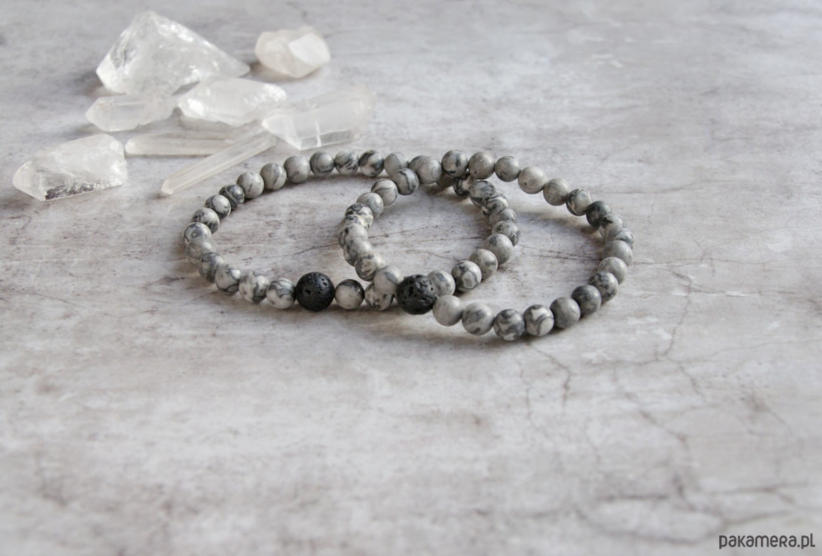 2x delikatna niezwykle ciekawa bransoletka- talizman wykonana z kuleczek matowego, szarego jaspisu koronkowego (6mm) i porowatej lawy wulkanicznej (kuleczki 8mm). na solidnej gumce jubilerskiej. bez elementów metalowych.