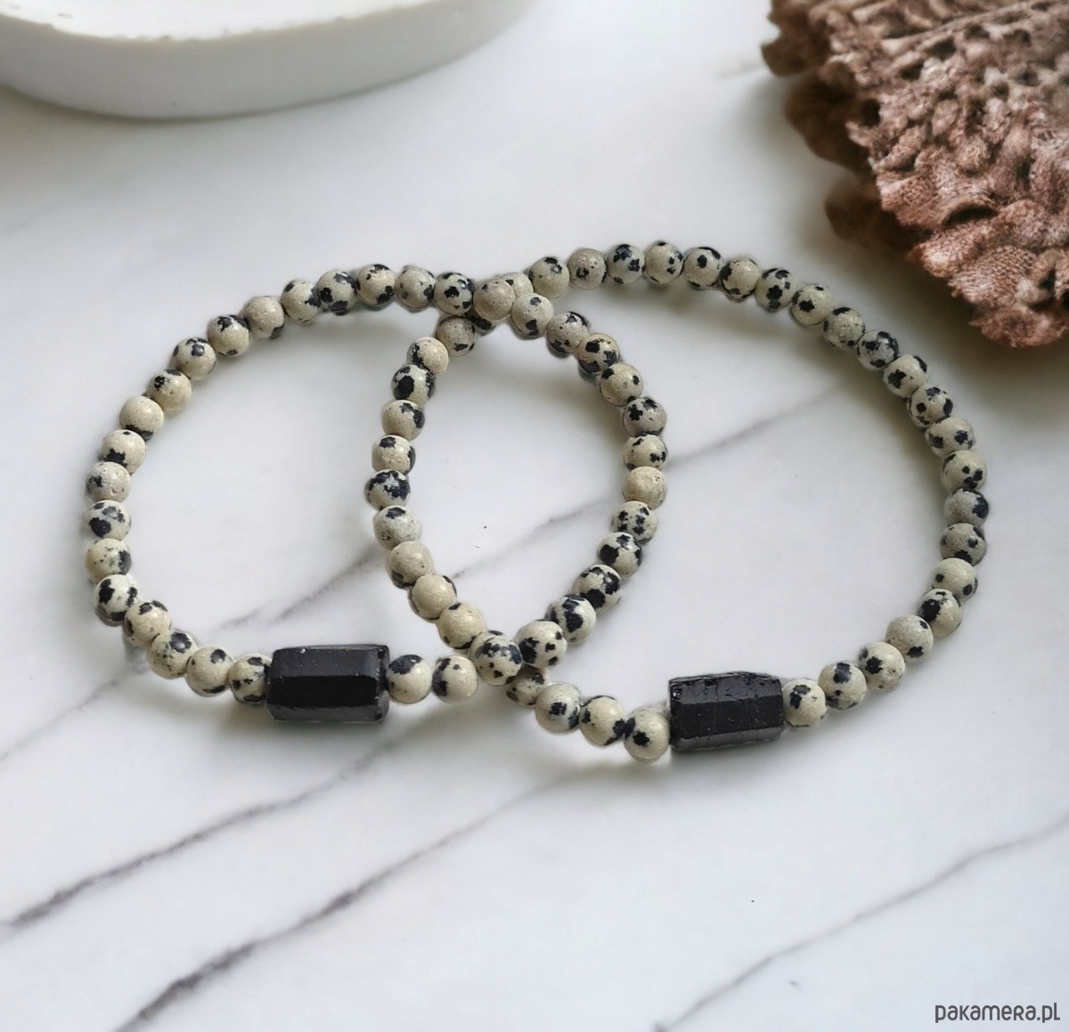 2x delikatna niezwykle ciekawa bransoletka- talizman wykonana z drobnych kuleczek jaspisu dalmatyńskiego (4mm) i surowej bryłki czarnego turmalinu.na solidnej gumce jubilerskiej. bez elementów metalowych.