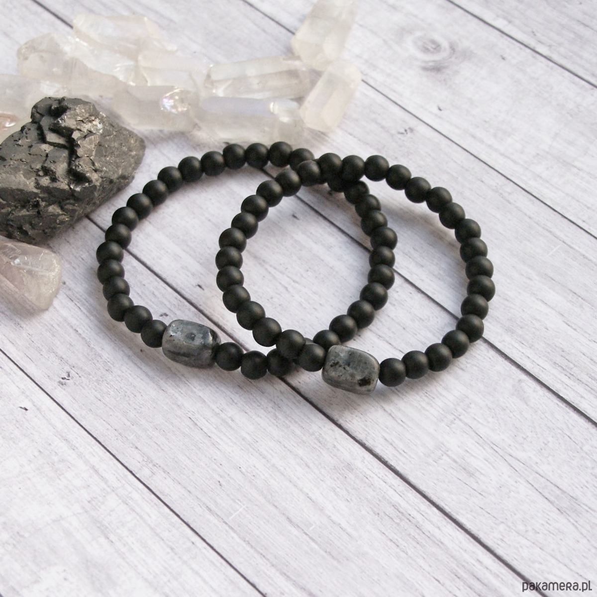2x delikatna niezwykle ciekawa bransoletka- talizman wykonana z kuleczek matowego onyksu (6mm) oraz bryłek labradorytu -