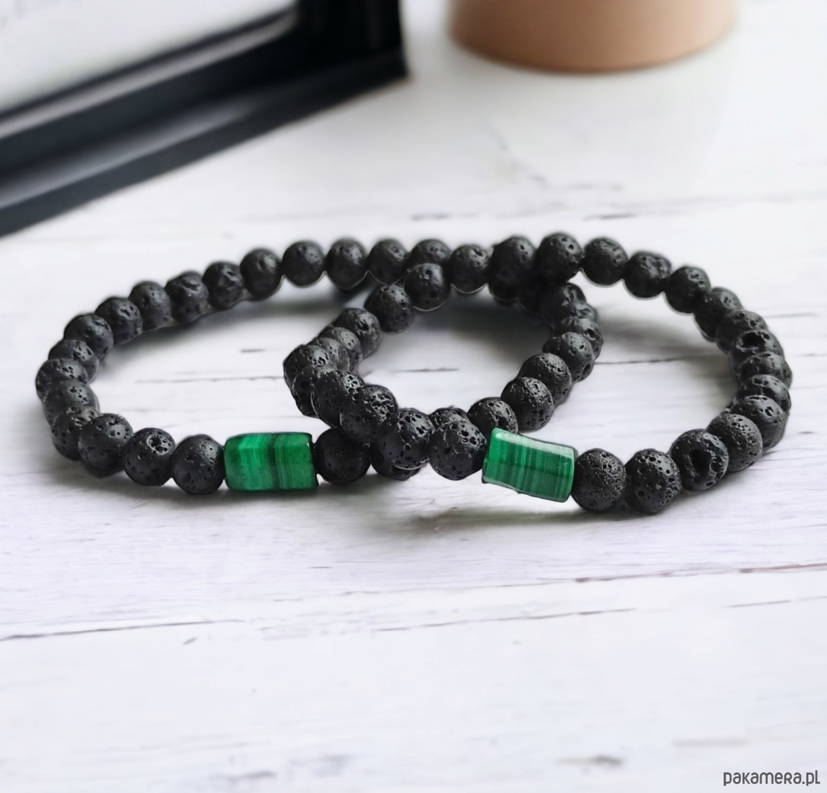 2x delikatna niezwykle ciekawa bransoletka- talizman wykonana z porowatej lawy wulkanicznej (6mm) i naturalnego malachitu w formie nieregularnych, POLEROWANYCH bryłek (ok. 11-12mm)