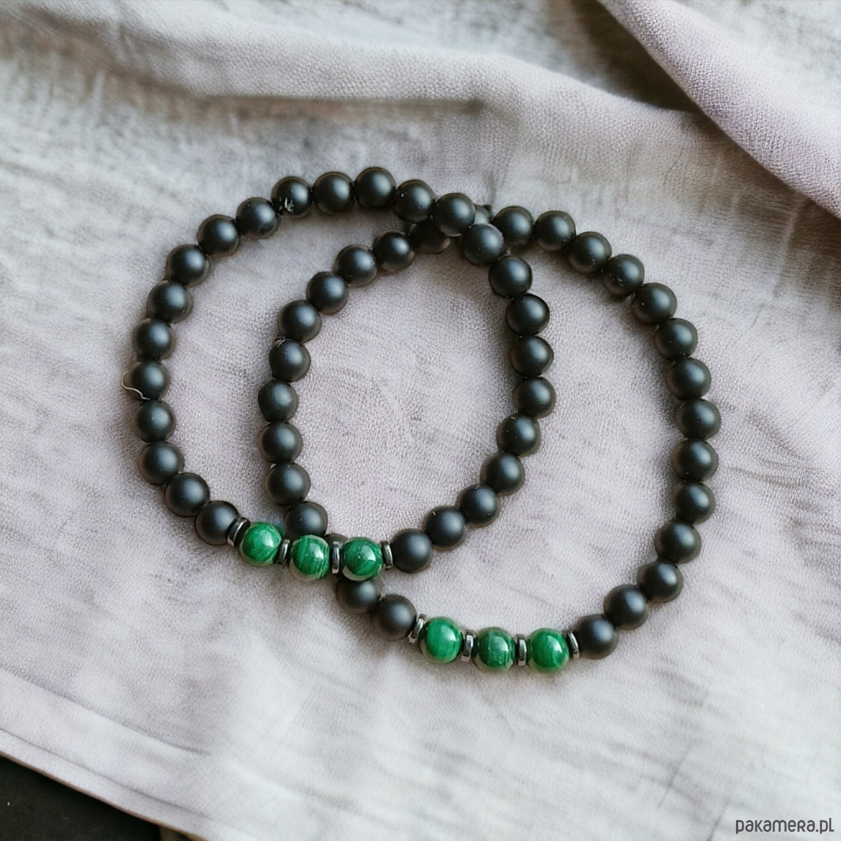 2x delikatna niezwykle ciekawa bransoletka- talizman wykonana z matowego onyksu (6mm) i naturalnego malachitu , przekładek z hematytu. BEZ ELEMENTÓW METALOWYCH.