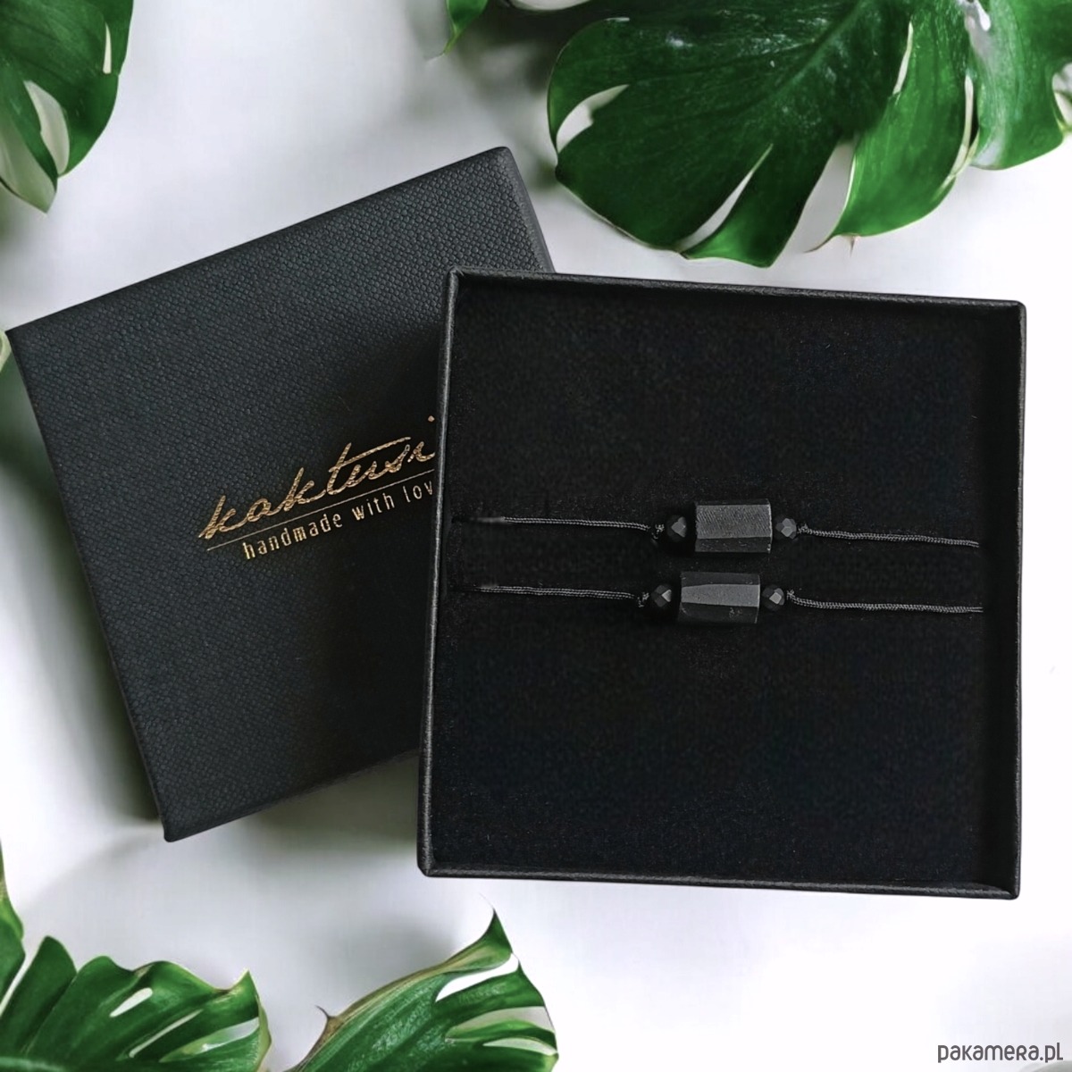 2x minimalistyczna bransoletka ochronna w eleganckim pudełku jubilerskim z logo marki kaktusia.