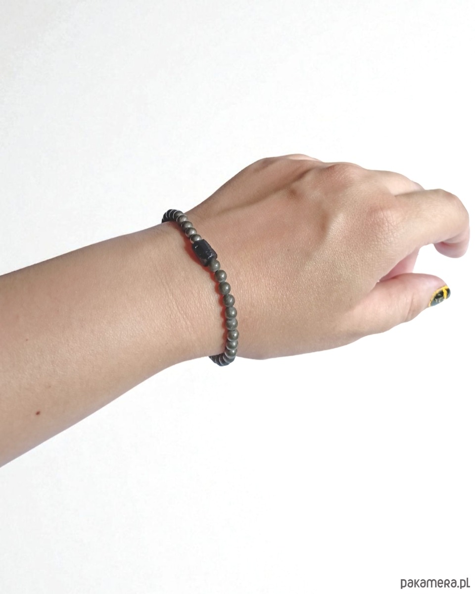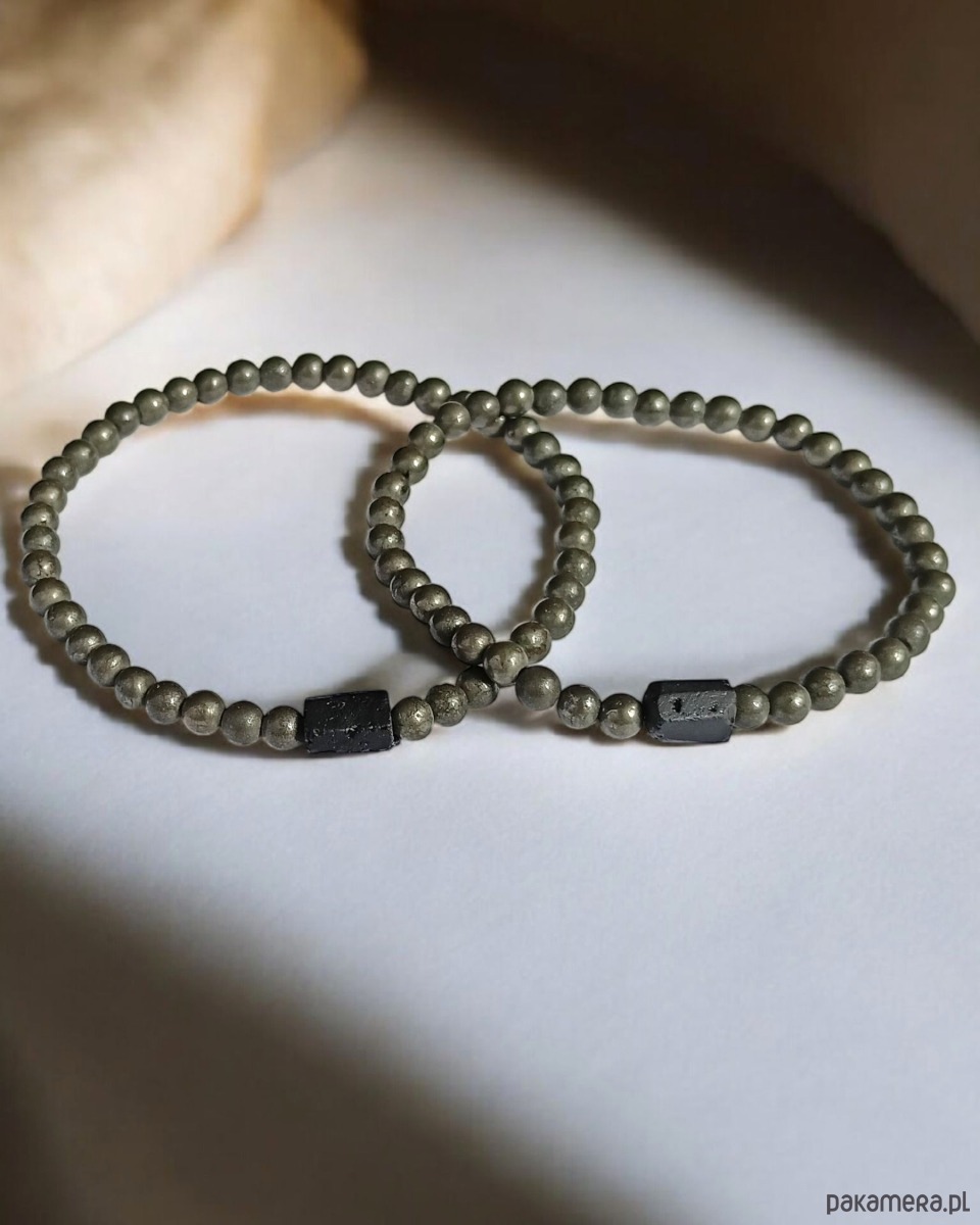 2x delikatna niezwykle ciekawa bransoletka- talizman wykonana z półmatowego, ciemnozłotego pirytu (kuleczki 4mm) i niewielkiej, surowej bryłki czarnego turmalinu (ok.8mm)