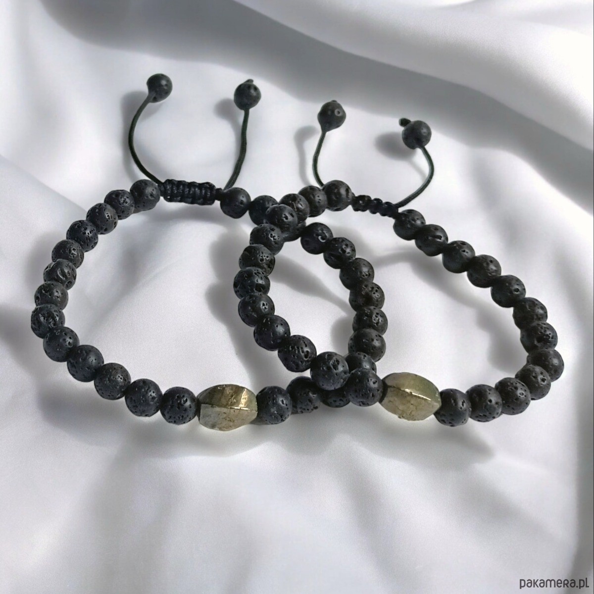 TUTAJ: 2xprosta, lecz ciekawa bransoletka wykonana z kul porowatej lawy wulkanicznej 6mm, z elementem twist z pirytu(ok. 10mm)