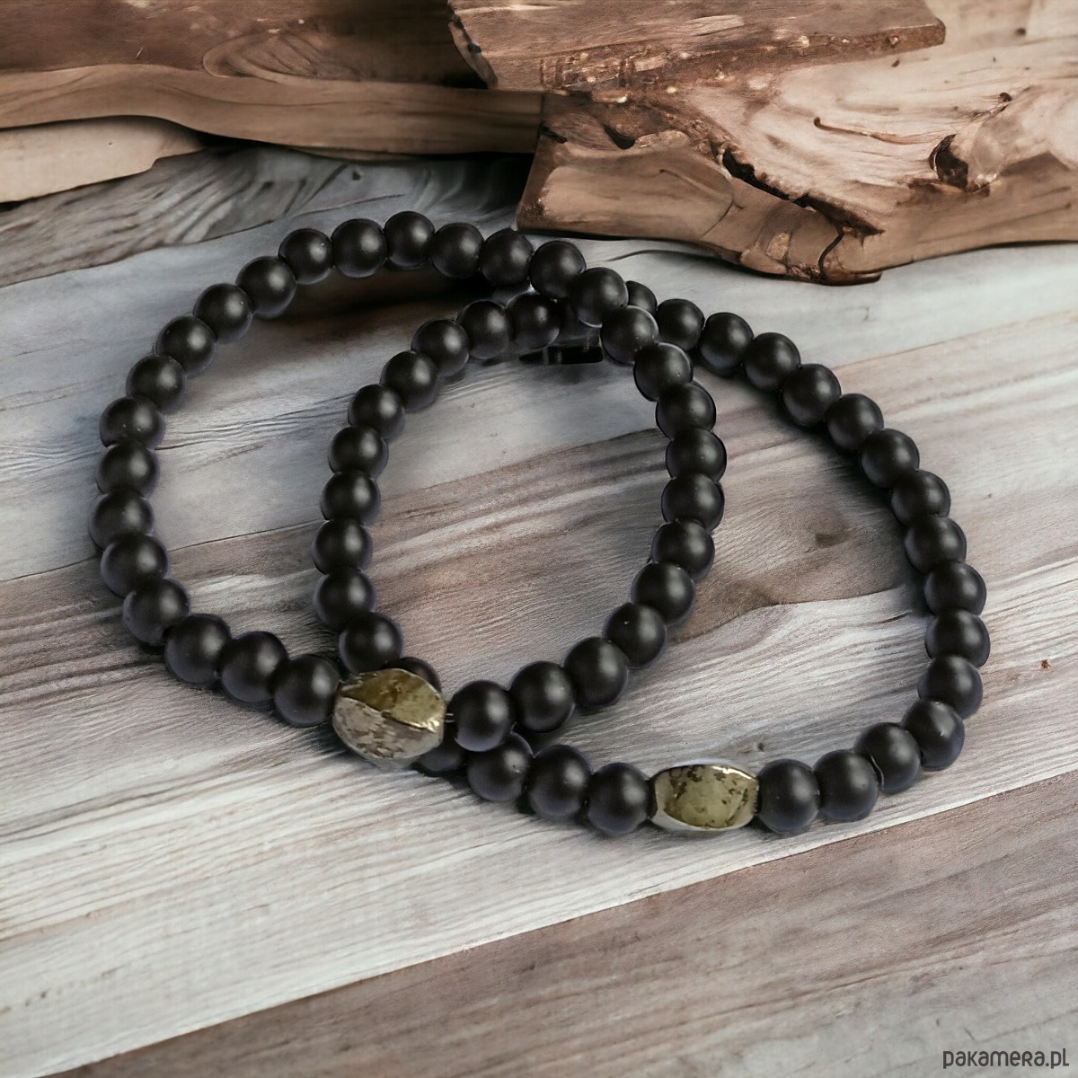 TUTAJ: 2xprosta, lecz ciekawa bransoletka wykonana z kul matowego onyksu 6mm, z elementem twist z pirytu(ok. 10mm)
