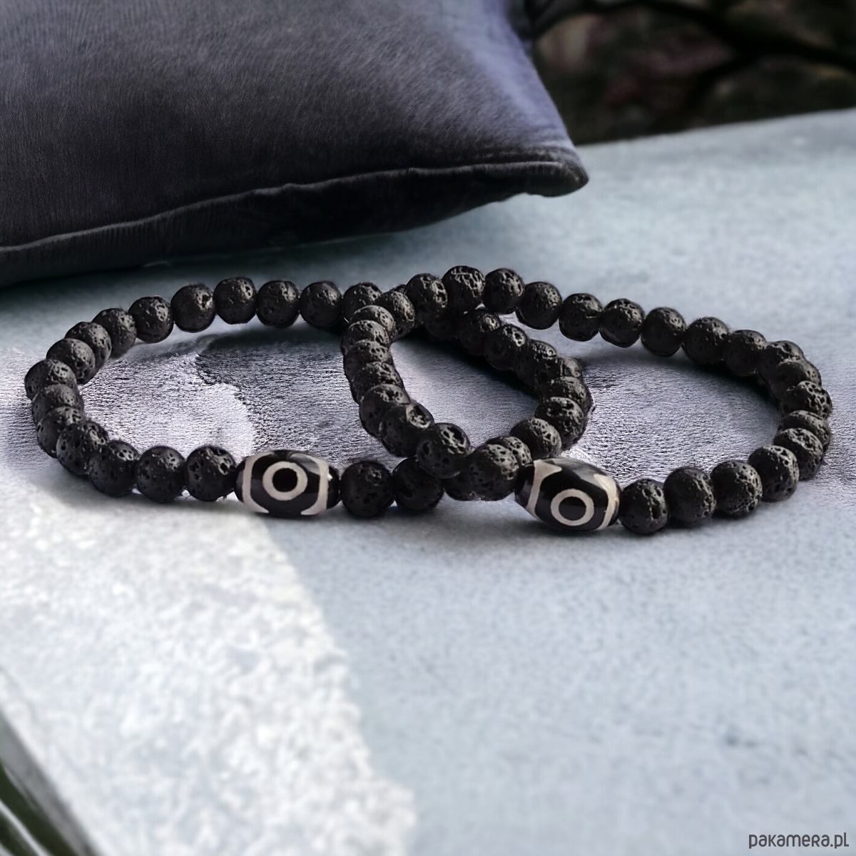 2x delikatna niezwykle ciekawa bransoletka- talizman wykonana z porowatej lawy wulkanicznej (kuleczki 6mm) oraz elementu z AGATU TYBETAŃSKIEGO (czerń + beż)