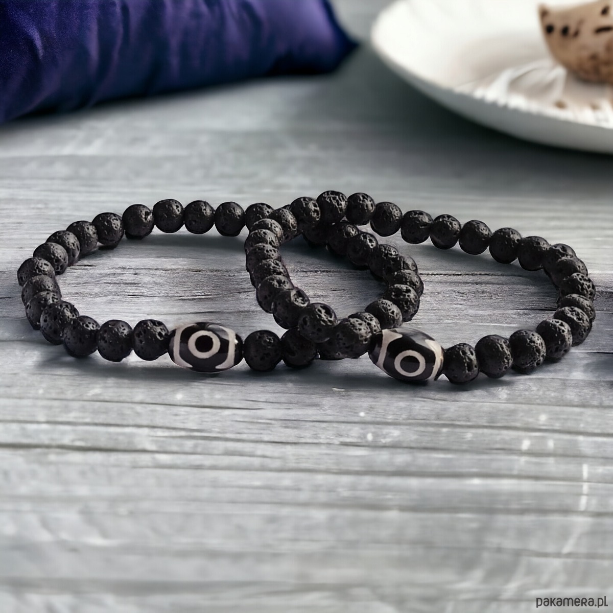 2x delikatna niezwykle ciekawa bransoletka- talizman wykonana z porowatej lawy wulkanicznej (kuleczki 6mm) oraz elementu z AGATU TYBETAŃSKIEGO (czerń + beż)