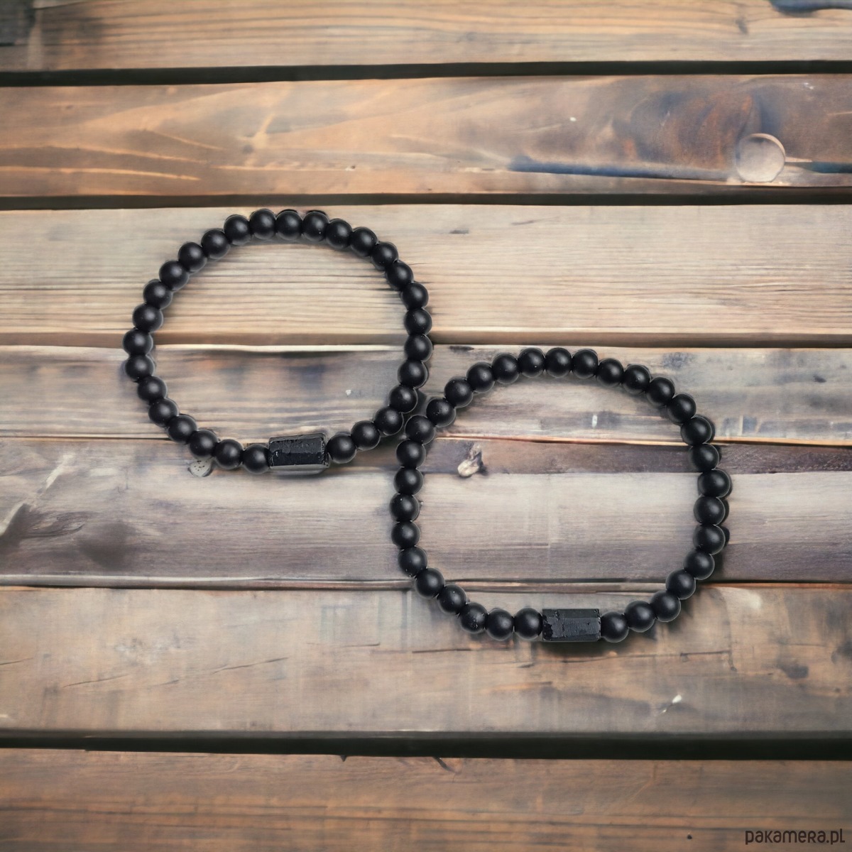 2x delikatna niezwykle ciekawa bransoletka- talizman wykonana z kuleczek matowego onyksu (6mm) oraz surowej bryłki czarnego turmalinu.