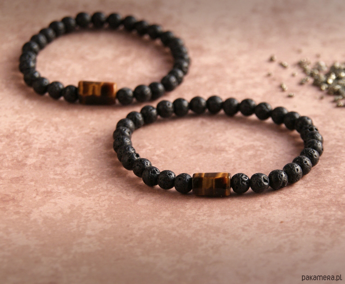 2x delikatna niezwykle ciekawa bransoletka- talizman wykonana z kuleczek porowatej lawy wulkanicznej (6mm) oraz nieregularnych, ciosanych słupków tygrysiego oka.