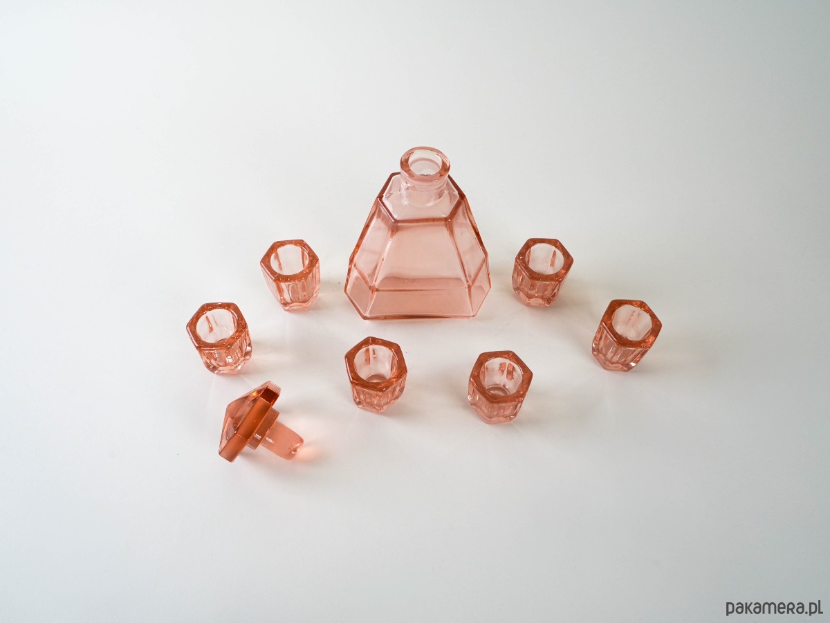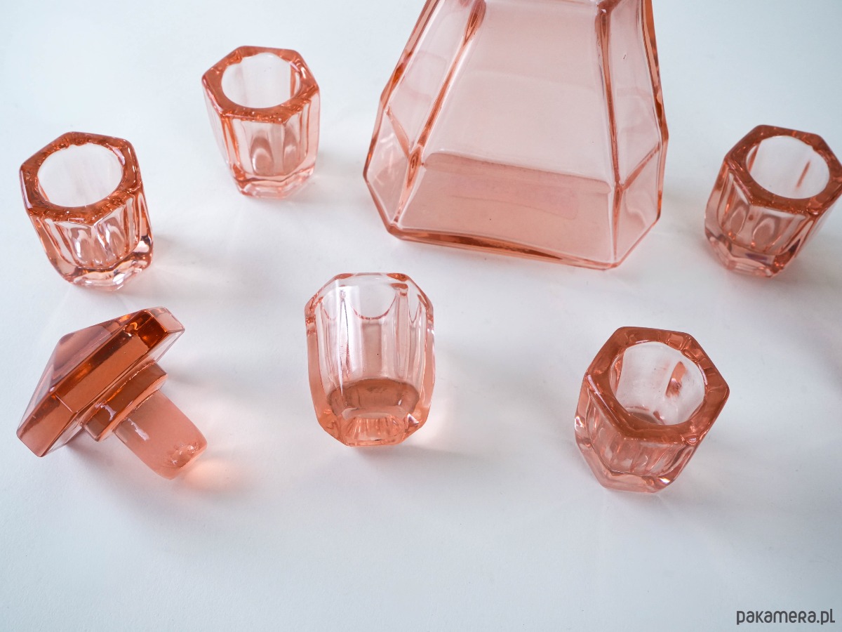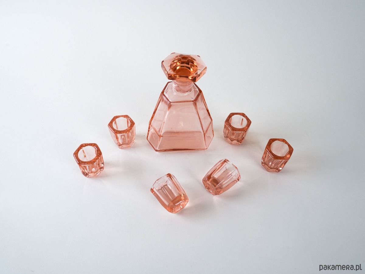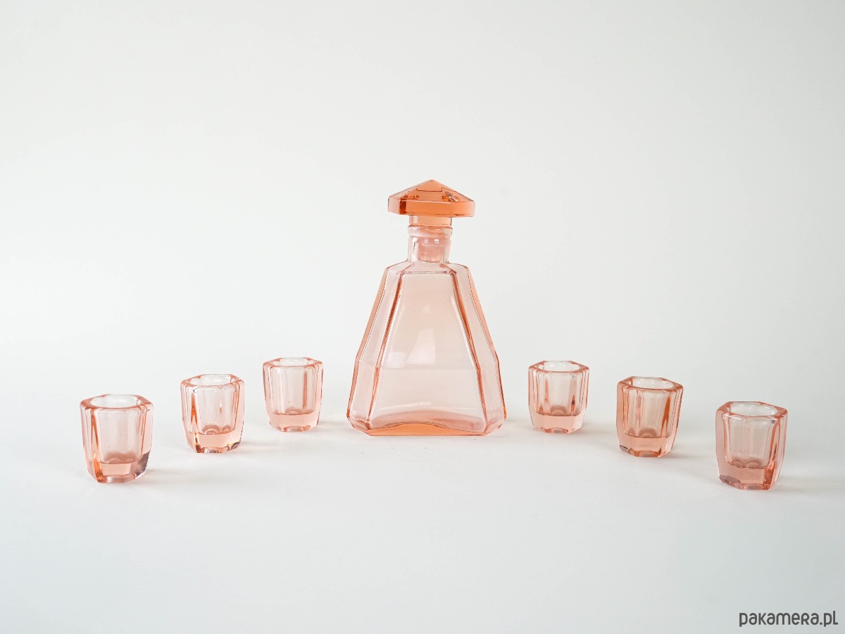 Geometryczny zestaw z różowego szkła prasowanego składający się z karafki z korkiem oraz sześciu kieliszków. Charakterystyczny kształt karafki oraz grubościenne kieliszki sugerują produkcję z Europy Środkowej z lat 60.