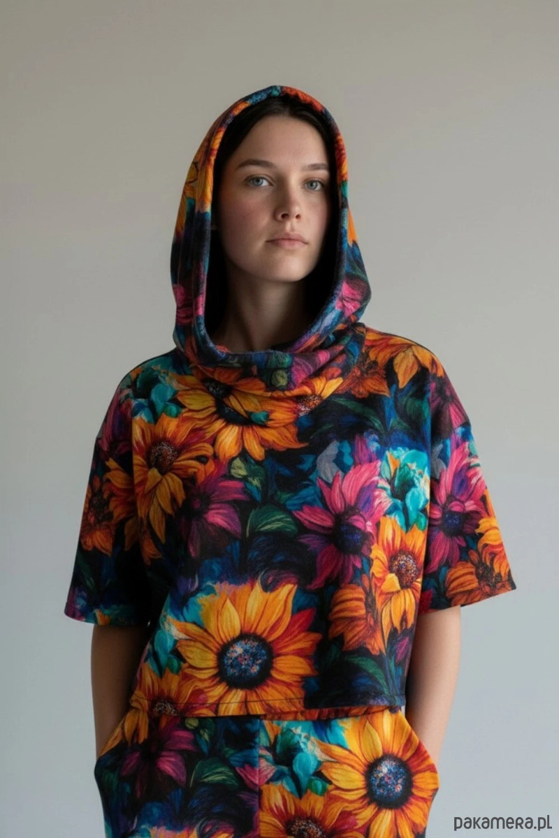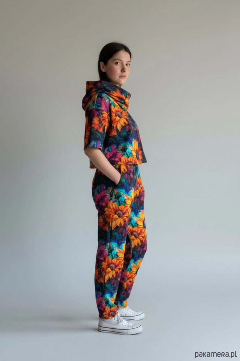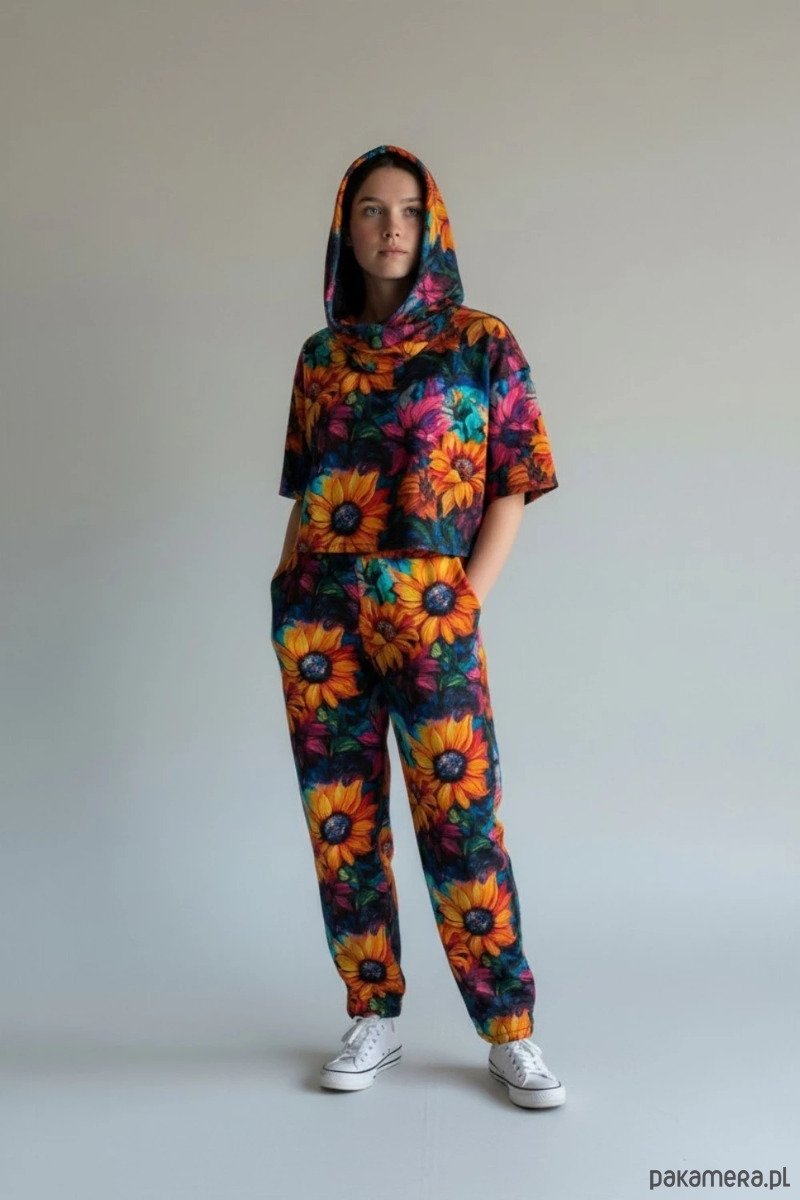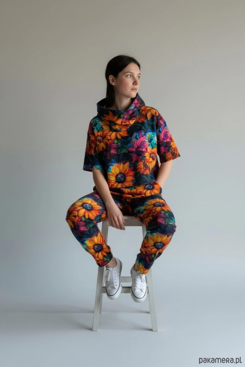 Wyjątkowy komplet dresowy damski składający się z bluzy Abhjasa oraz spodni Ahimsa z wyrazistym wzorem w słoneczniki. To model dla osób, które cenią wygodę, artystyczne printy i ubrania z charakterem.