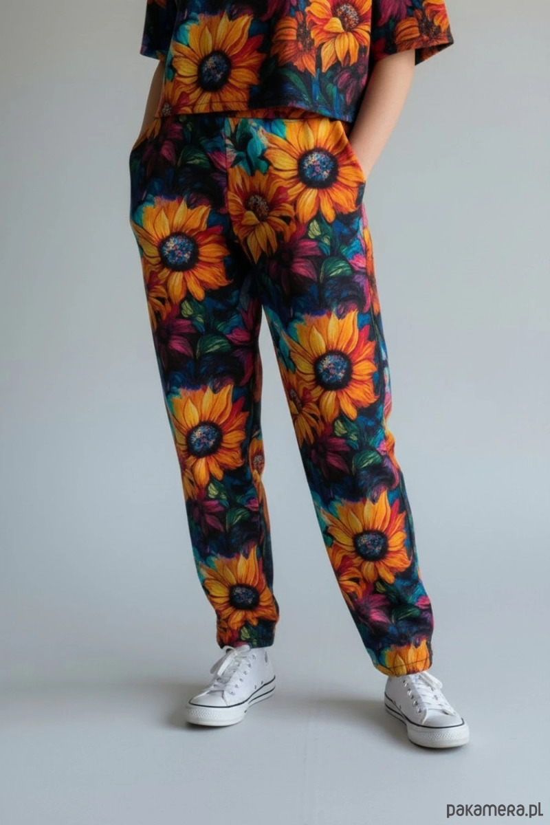 Komplet został uszyty przeze mnie w jednym egzemplarzu z doskonałej jakości, miękkiej dresówki. Materiał jest przyjemny w dotyku, elastyczny i dobrze układa się na sylwetce, zapewniając wysoki komfort noszenia. Oryginalny, kolorowy wzór w słoneczniki sprawia, że zestaw wyróżnia się i świetnie sprawdza się w codziennych stylizacjach.