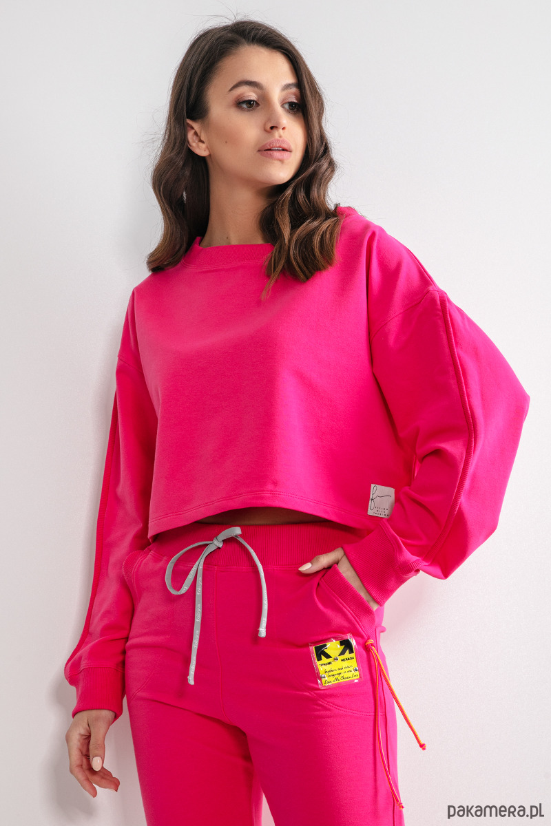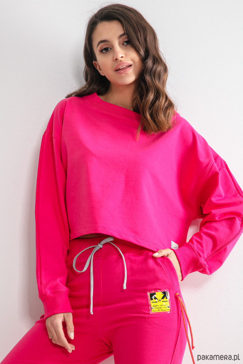 Wyjątkowy, stylowy komplet dresowy z dzianiny bawełnianej. Składający się z krótkiej, oversizowej bluzy oraz spodni z kieszeniami. Rękawy i nogawki zakończone mankietami. Ozdobna aplikacja na spodniach znajdująca się z przodu i tyłu nadaje charakteru. Komplet stanowi kapitalną całość. Kolory: czarny, niebieski, różowy, zielony.