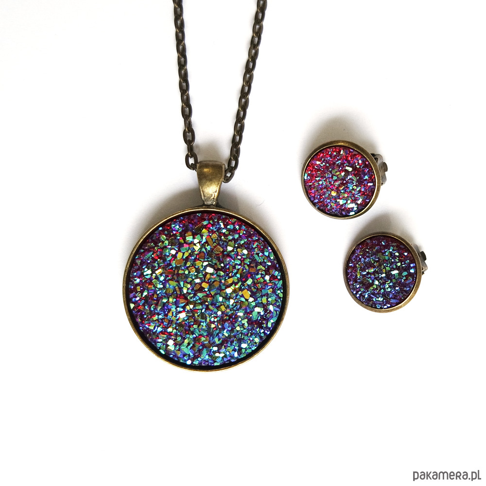 Elegancki komplet - naszyjnik i klipsy z kaboszonem z żywicy - druzy mieniący się w odcieniach bordo, fioletu, niebieskiego, turkusu i złota.