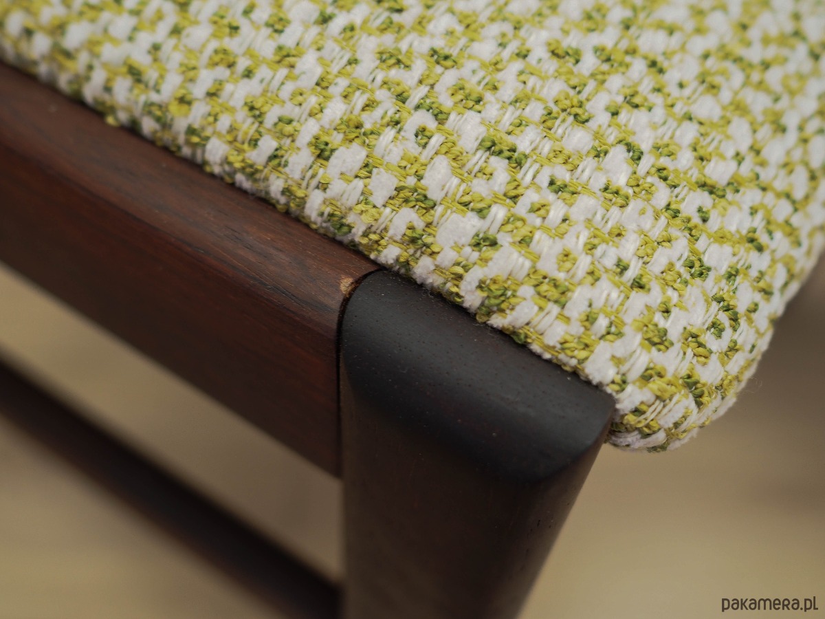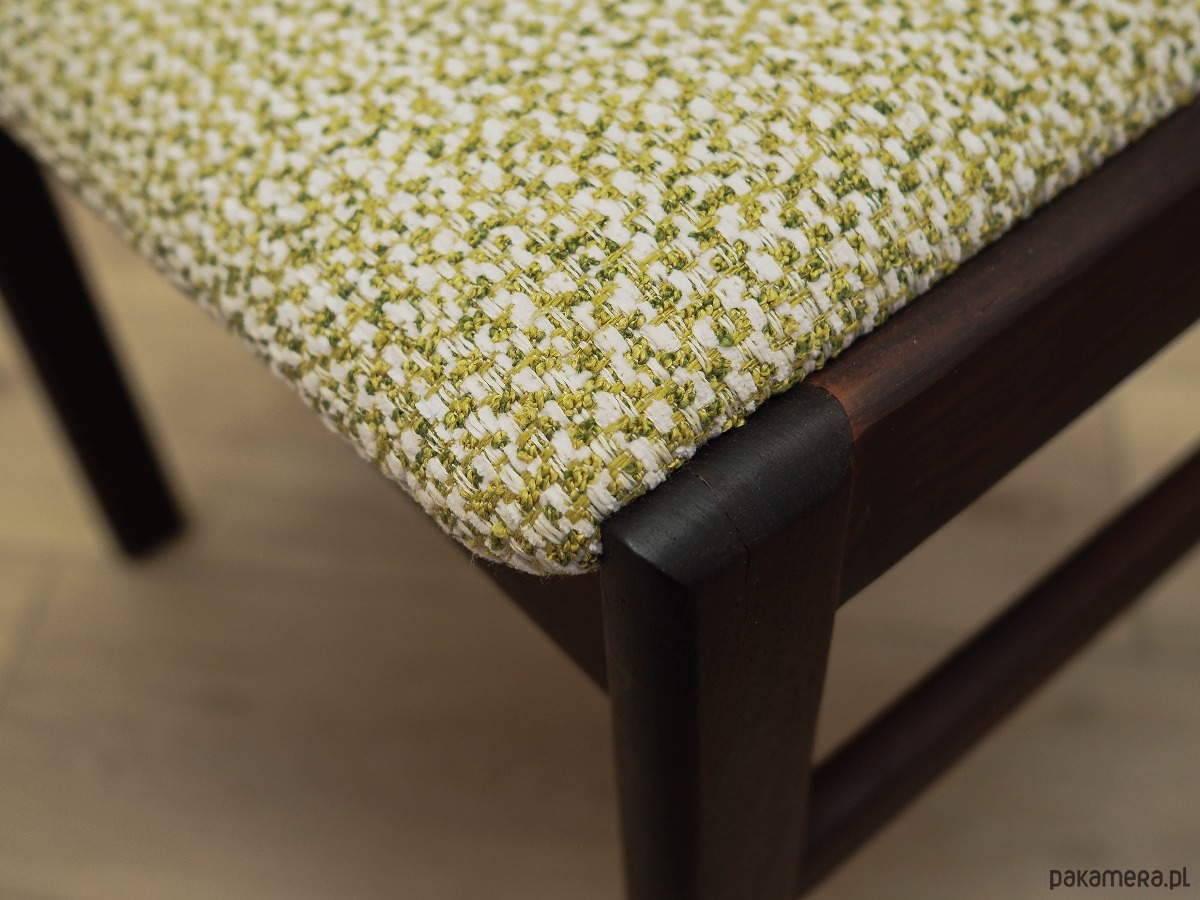 Konstrukcja wykonana z drewna palisandrowego. Drewno po odświeżeniu. Krzesła posiadają nową tapicerkę. Do renowacji użyto wysokiej jakości wielokolorowej tkaniny.