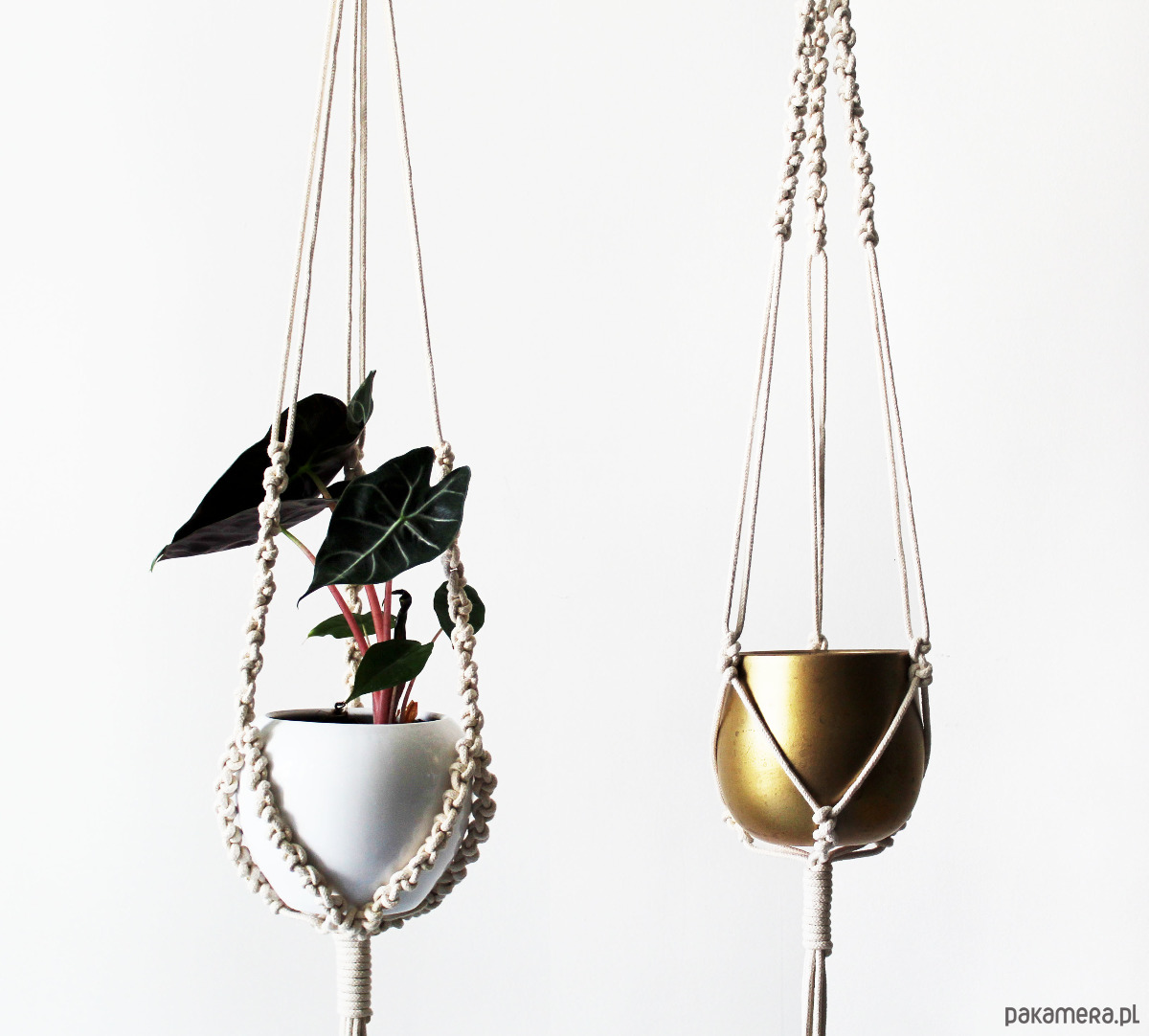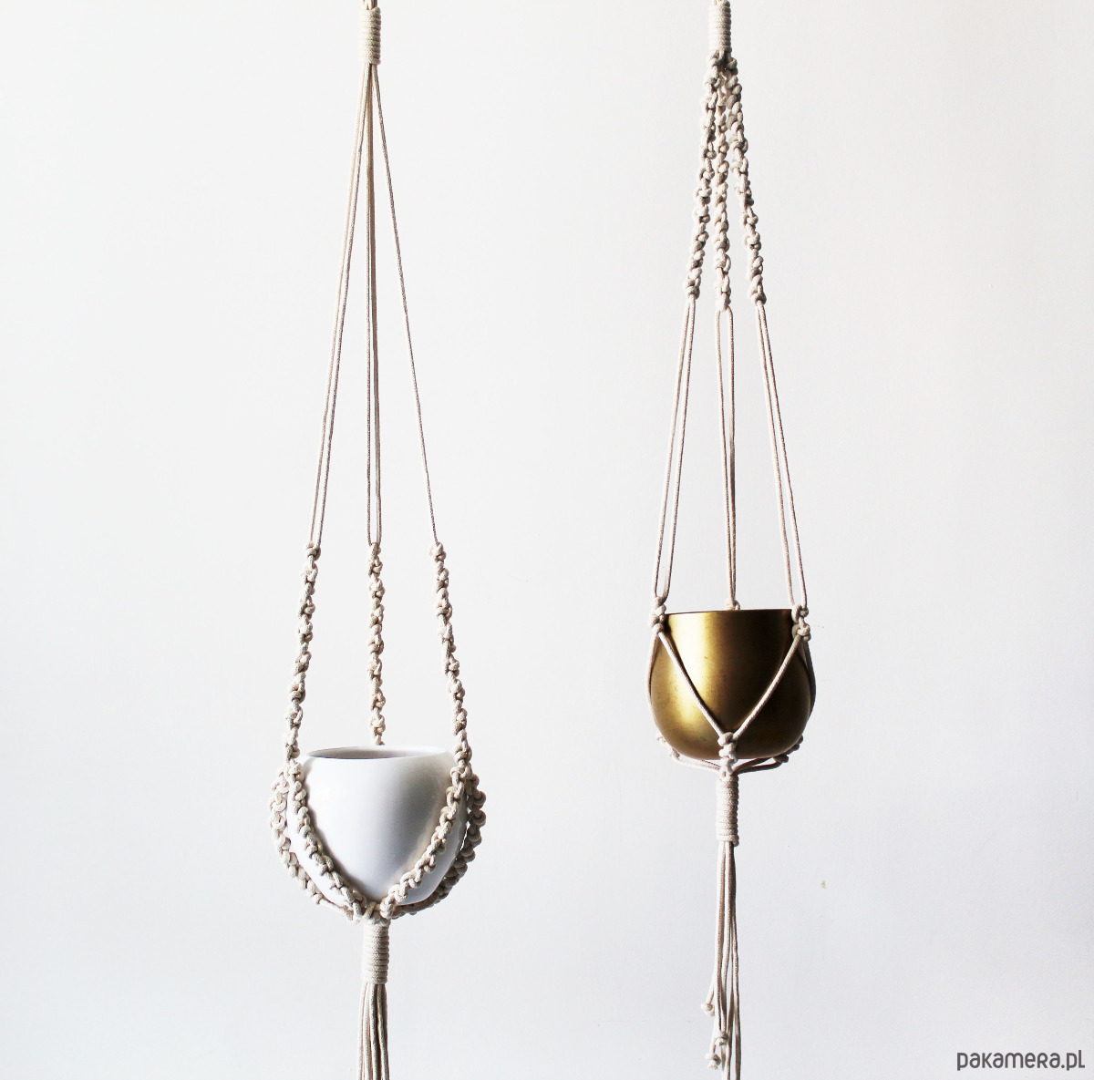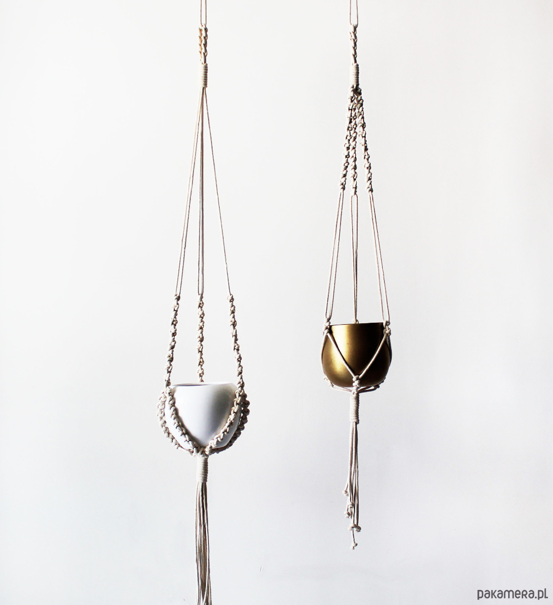 Komplet dwóch kwietników wyplatanych ręcznie ze sznurka bawełnianego (techniką makramy). Minimalistyczny styl.