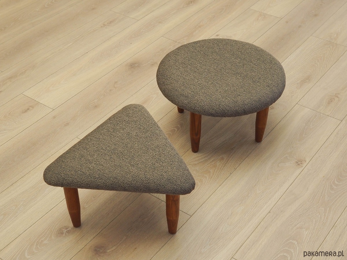 Nogi wykonane z litego drewna bukowego. Drewno po odświeżeniu. Podnóżki zostały poddane renowacji tapicerskiej, gąbki siedziskowe oraz tkanina wymienione na nowe. Tapicerka została wykonana w kolorze brązowym, wykorzystana została wysokogatunkowa tkanina o wyraźnym splocie.