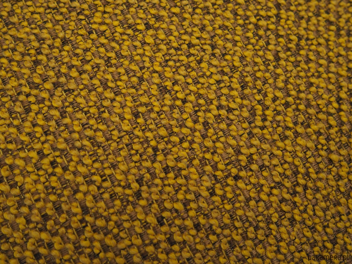 Nogi wykonane z litego drewna bukowego. Drewno po odświeżeniu. Podnóżki zostały poddane renowacji tapicerskiej, gąbki siedziskowe oraz tkanina wymienione na nowe. Tapicerka została wykonana w kolorze musztardowym, wykorzystana została wysokogatunkowa tkanina o wyraźnym splocie.