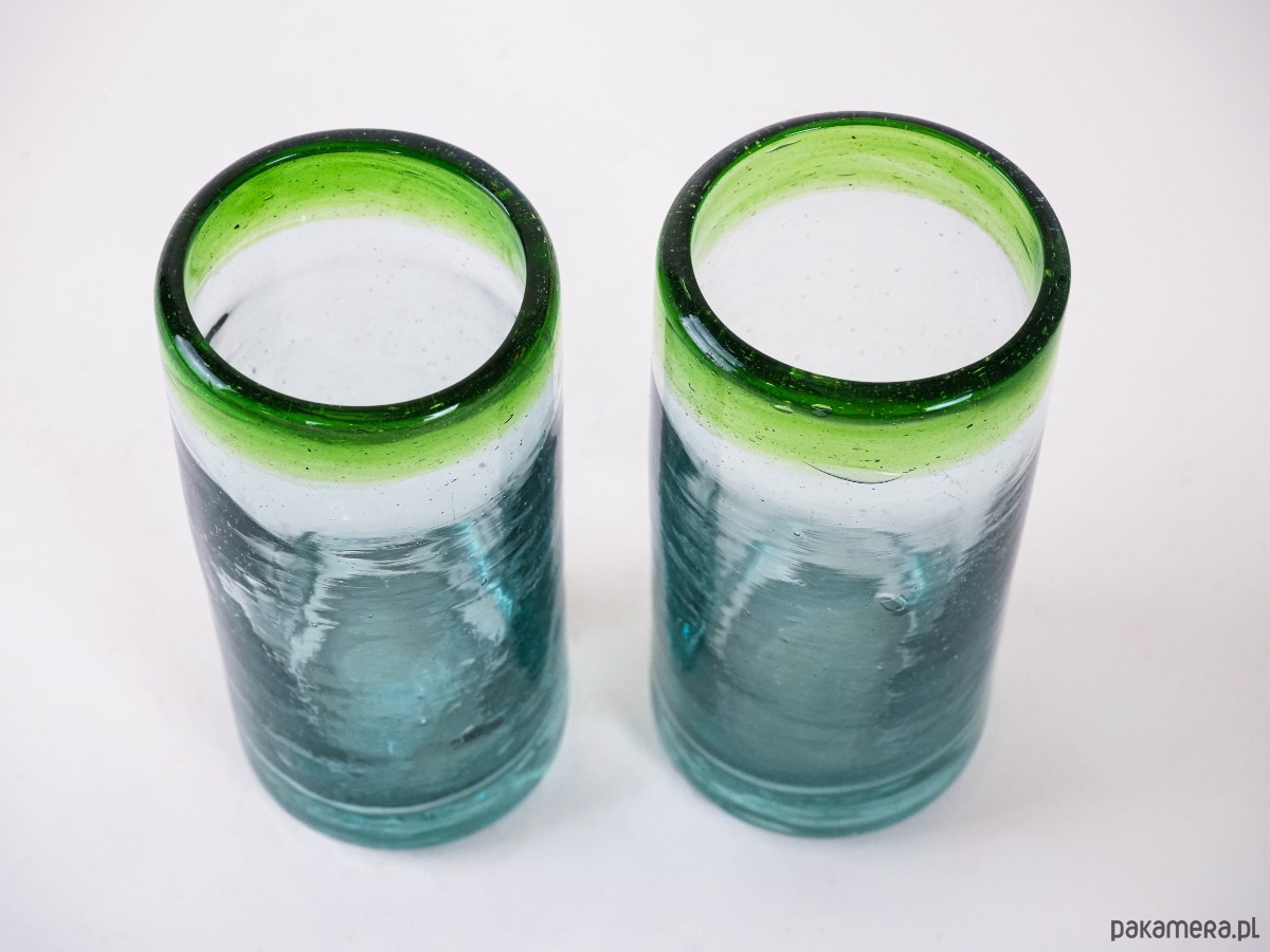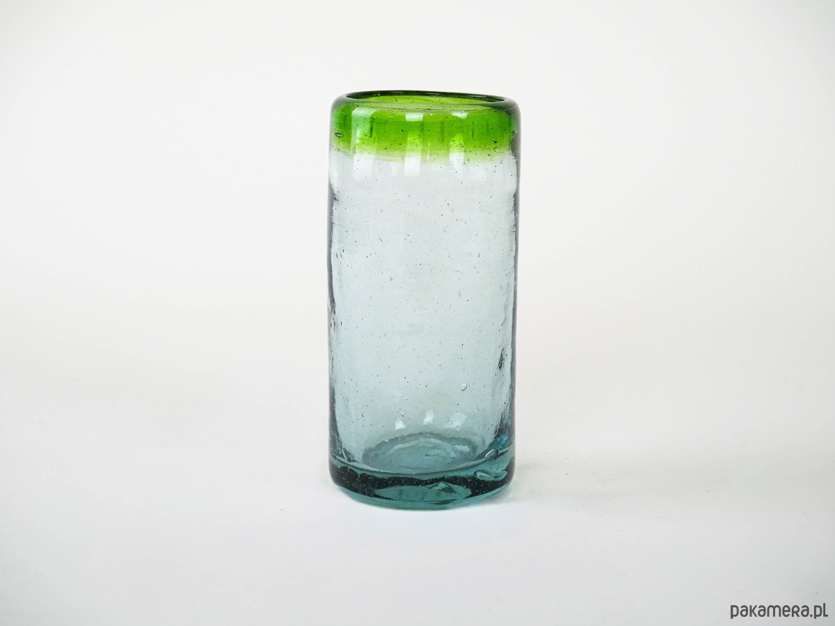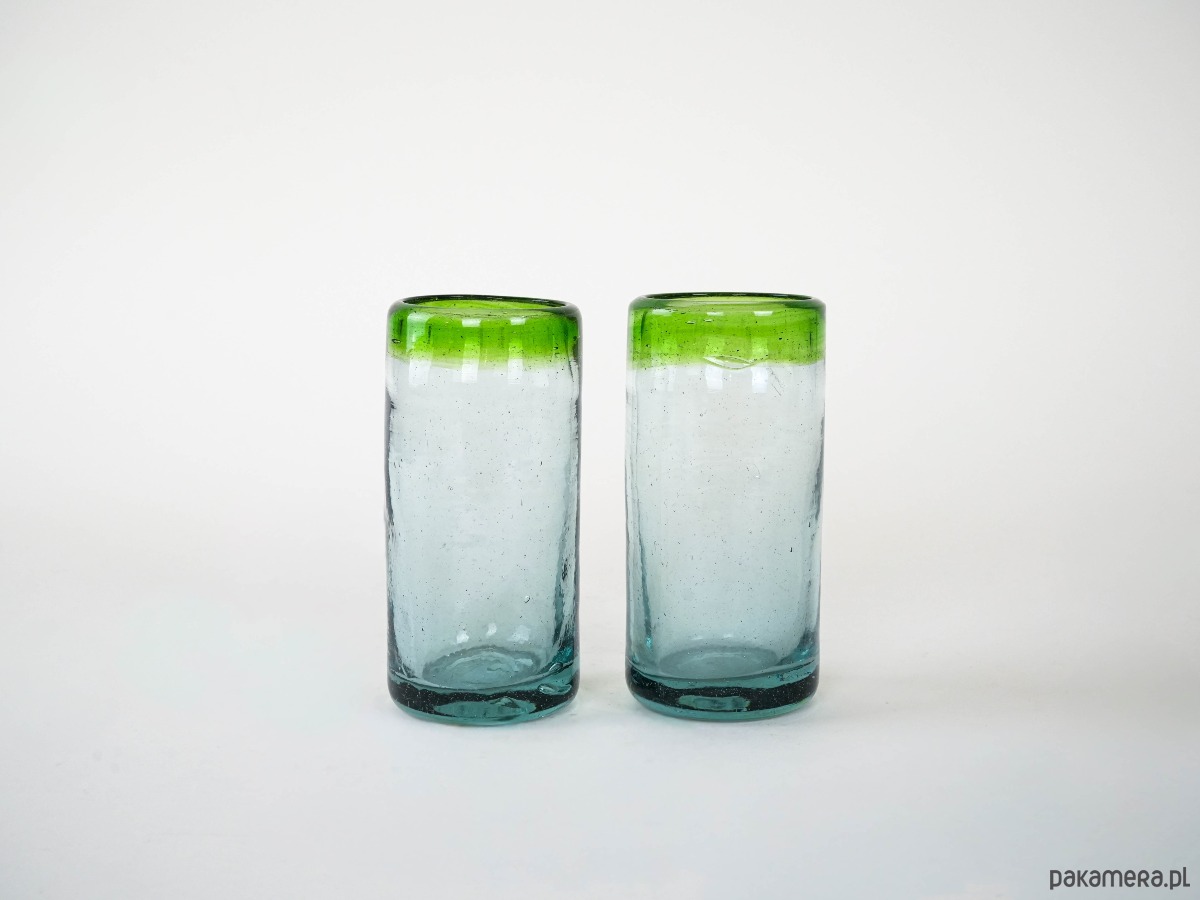 Dwie wysokie szklanki wykonane ręcznie ze szkła dmuchanego, z charakterystycznymi pęcherzykami powietrza w masie i zielonym rantem. Minimalistyczne, a jednocześnie dekoracyjne – idealne do serwowania drinków, soków czy wody, ale także jako nietuzinkowa dekoracja stołu. Wyjątkowe rzemiosło, które podkreśla unikatowy charakter każdej sztuki.