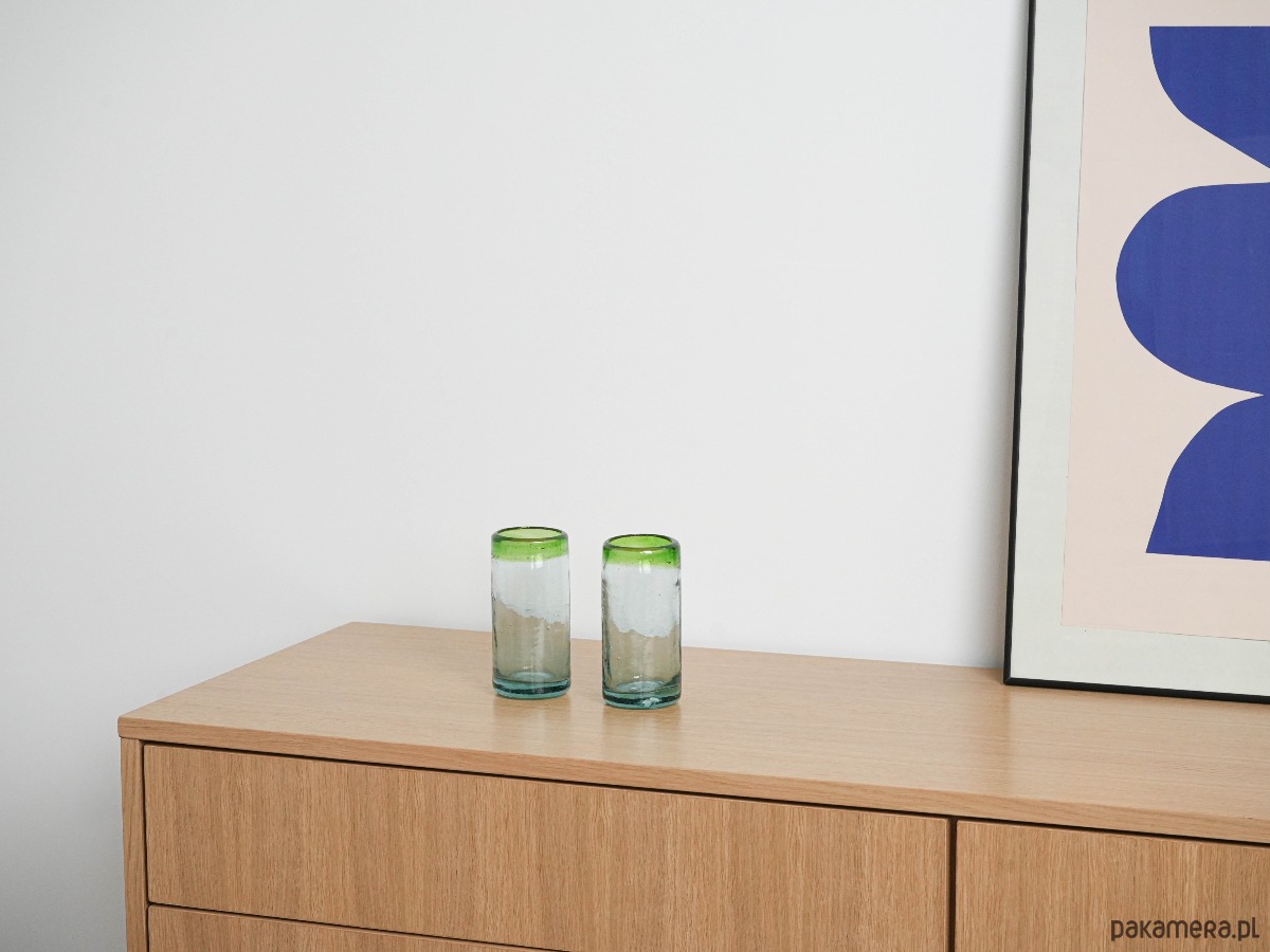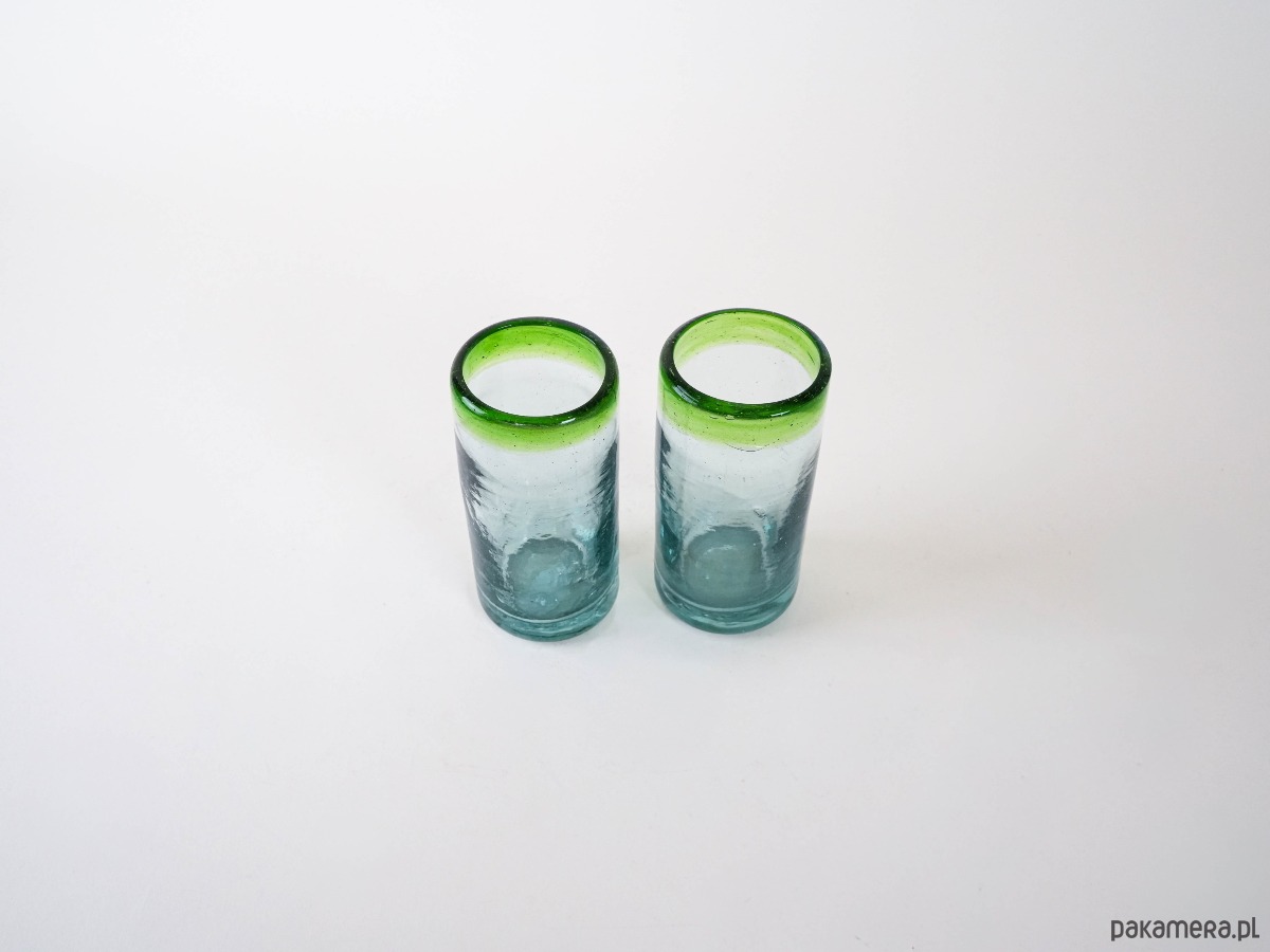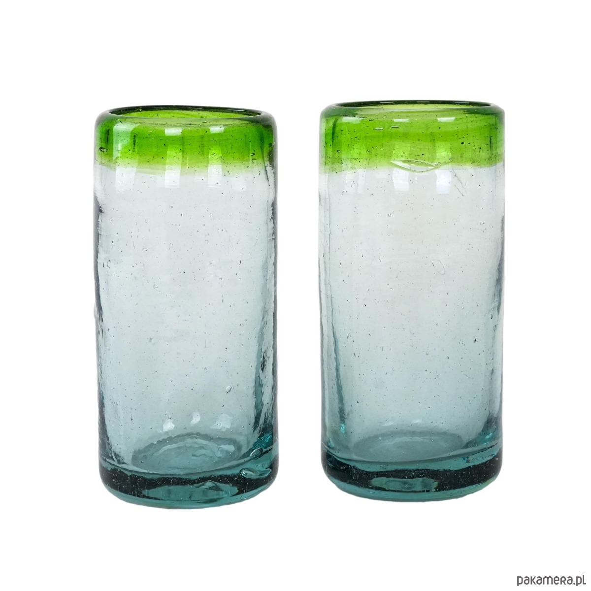 Dwie wysokie szklanki wykonane ręcznie ze szkła dmuchanego, z charakterystycznymi pęcherzykami powietrza w masie i zielonym rantem. Minimalistyczne, a jednocześnie dekoracyjne – idealne do serwowania drinków, soków czy wody, ale także jako nietuzinkowa dekoracja stołu. Wyjątkowe rzemiosło, które podkreśla unikatowy charakter każdej sztuki.
