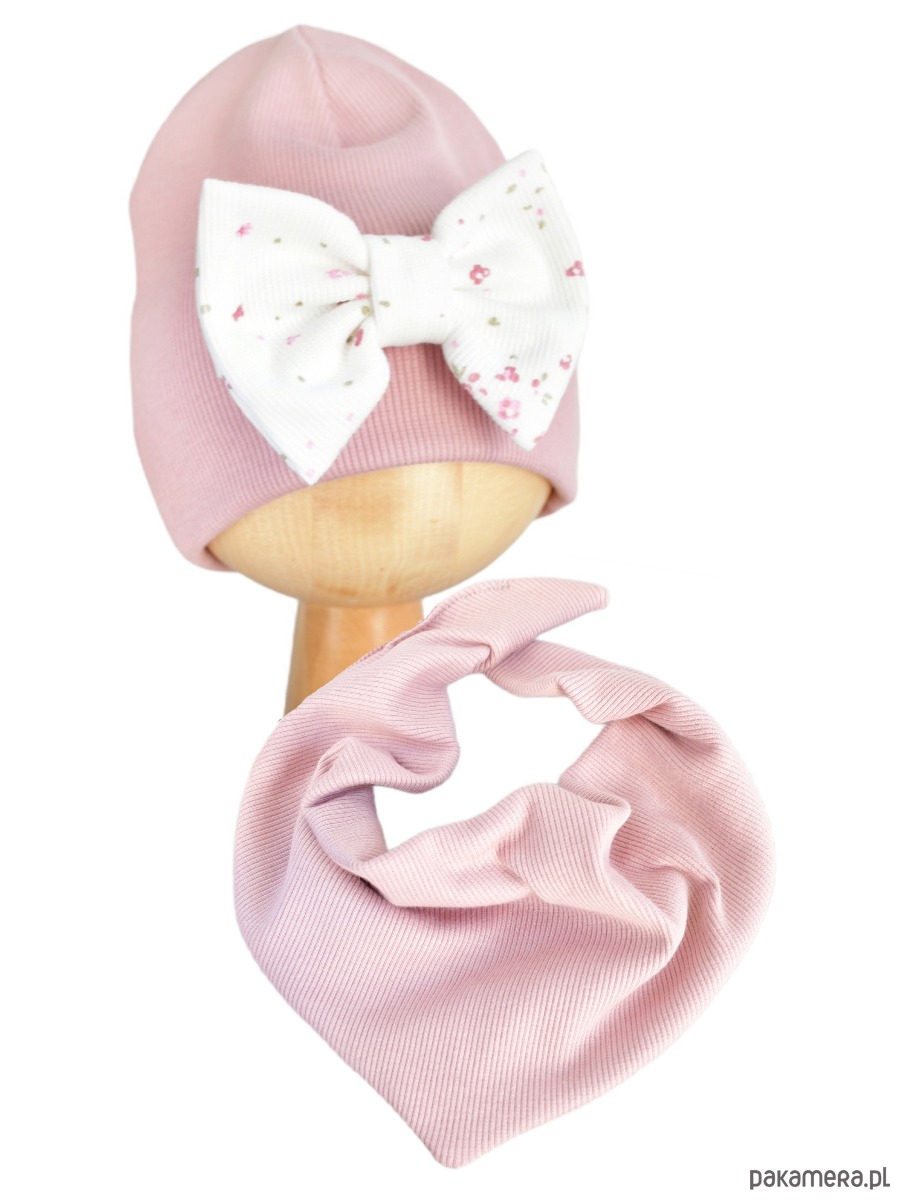Komplet dziecięcy czapka z kokardą i chusta brudny róż