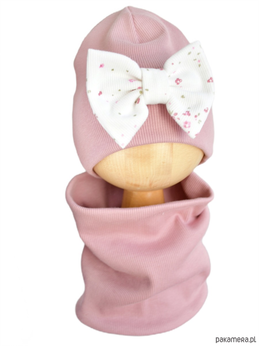 Komplet dziecięcy czapka z kokardą i komin brudny róż