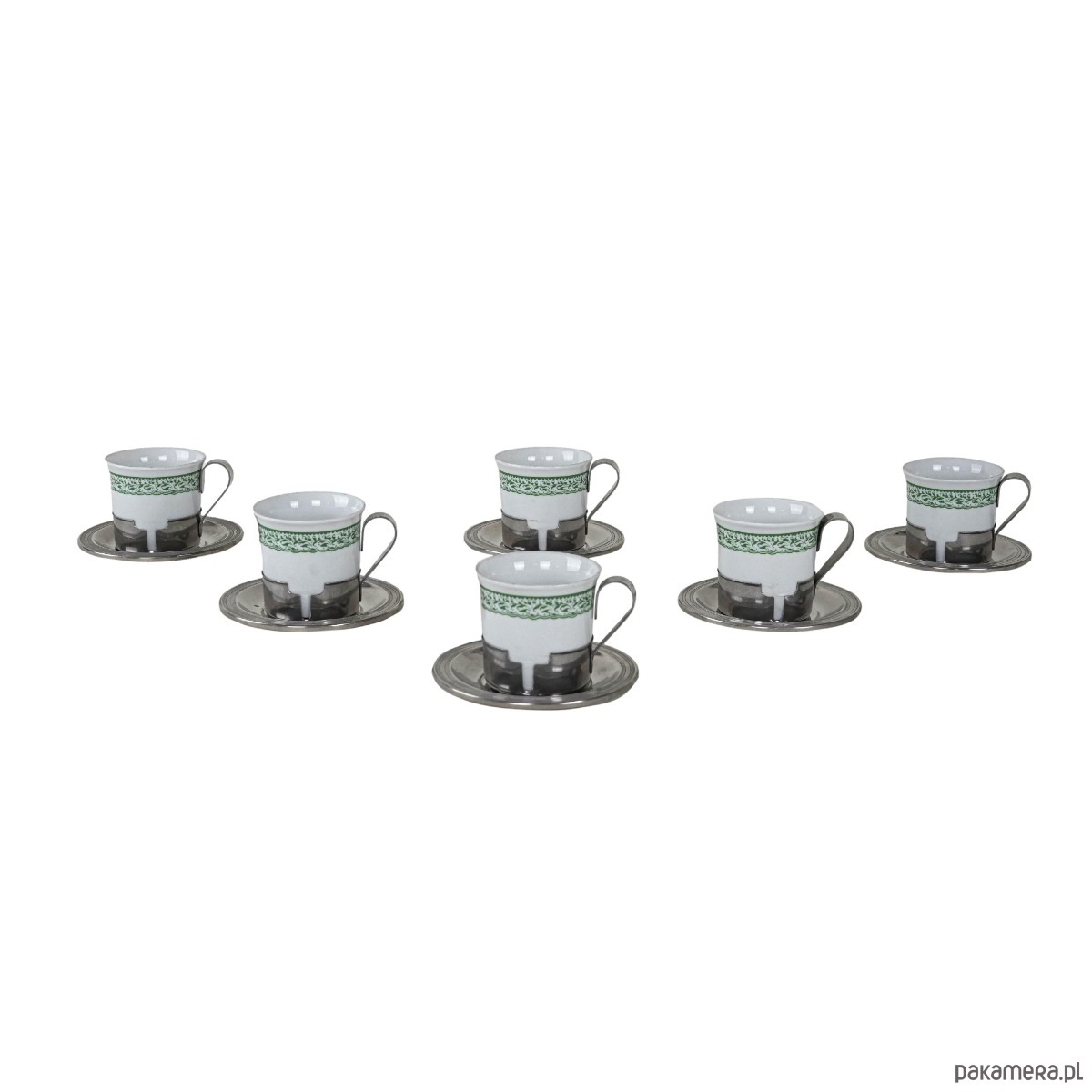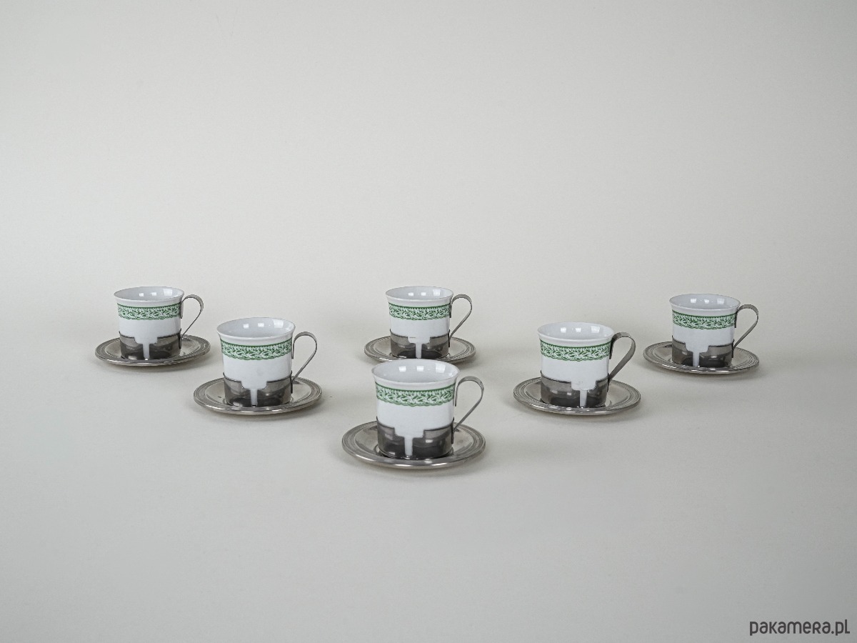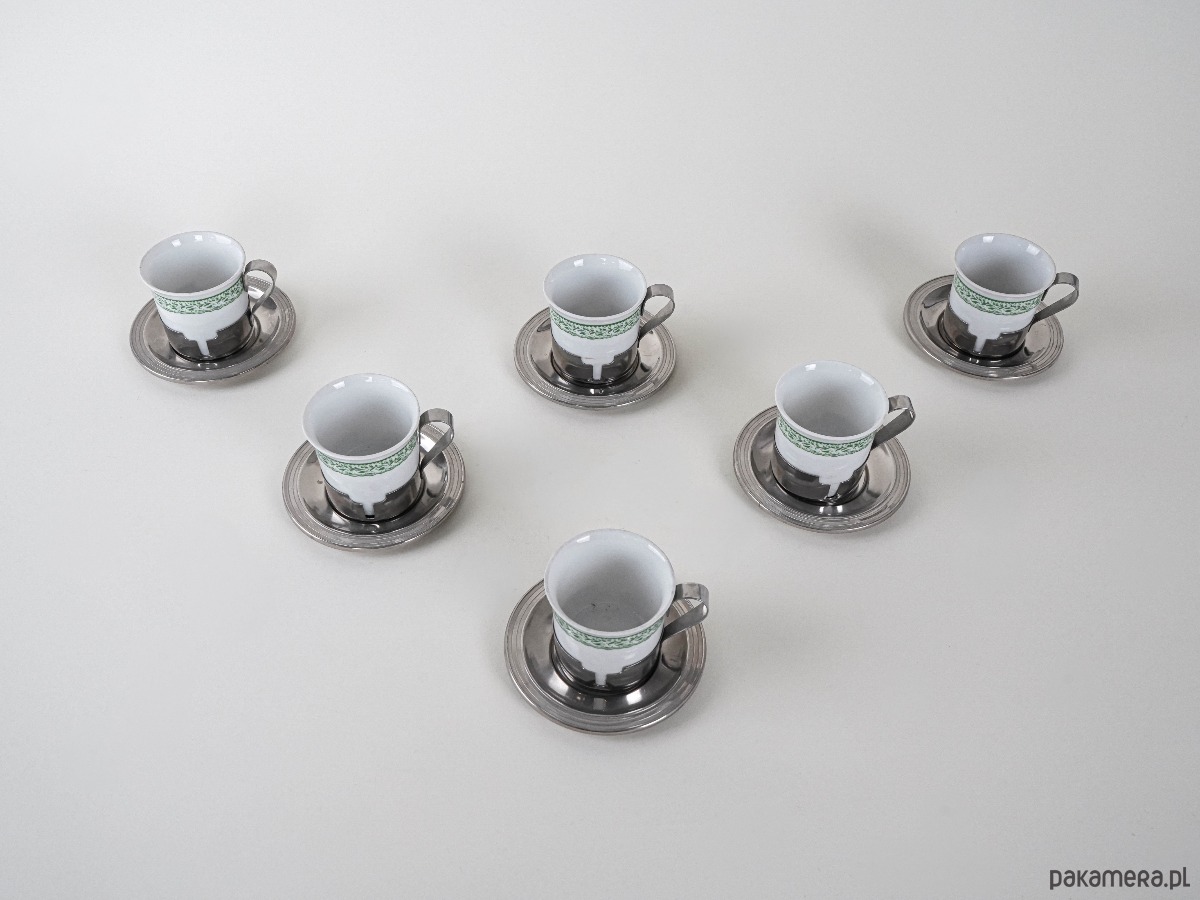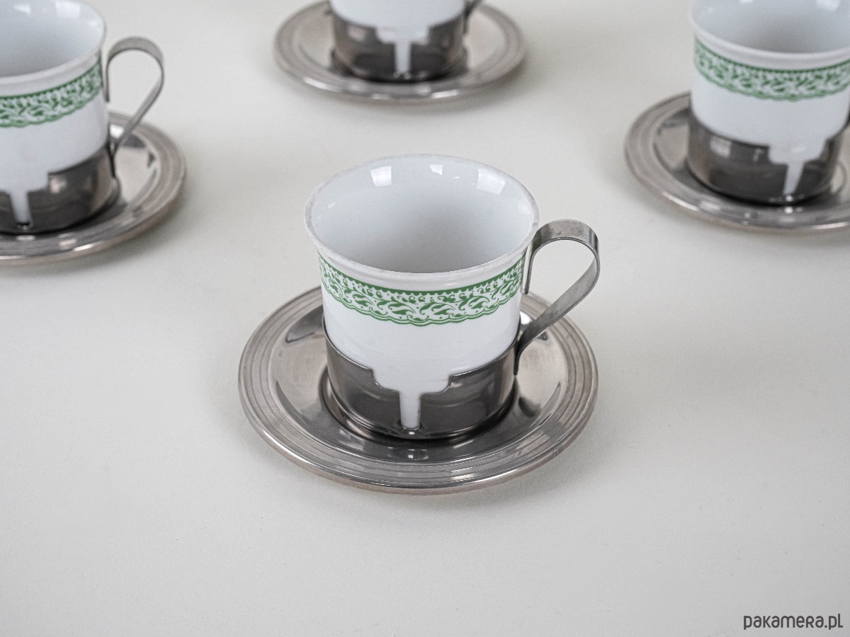 Komplet 6 filiżanek porcelanowych do espresso. Filiżanki z metalowymi uchwytami i podstawkami ze stali nierdzewnej. Porcelana zdobiona klasycznym, zielonym ornamentem roślinnym w stylu lat 70.–80. XX wieku. Połączenie chłodnej stali z eleganckim wzorem nadaje zestawowi ponadczasowy charakter – idealny do serwowania aromatycznego espresso w klimacie retro.