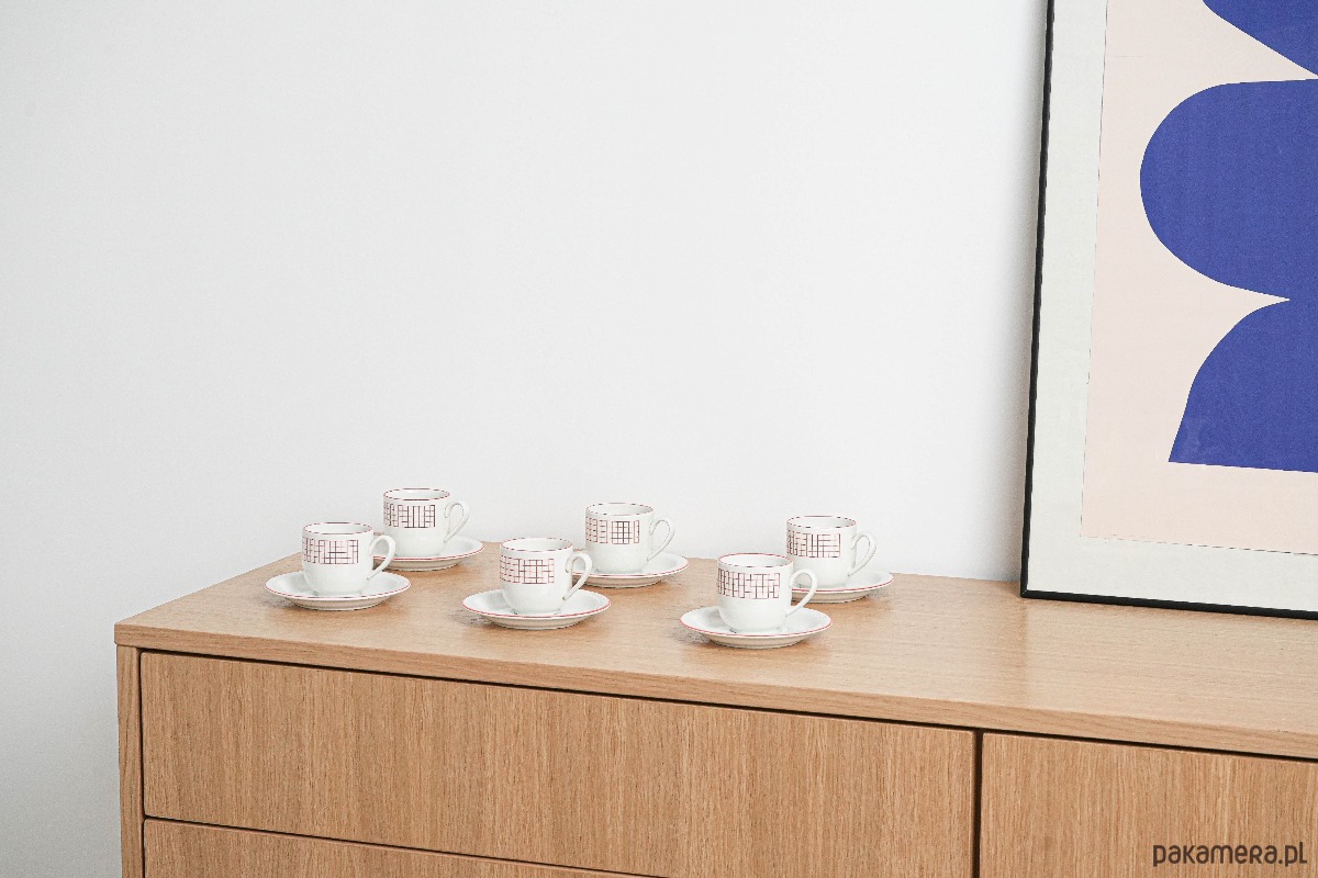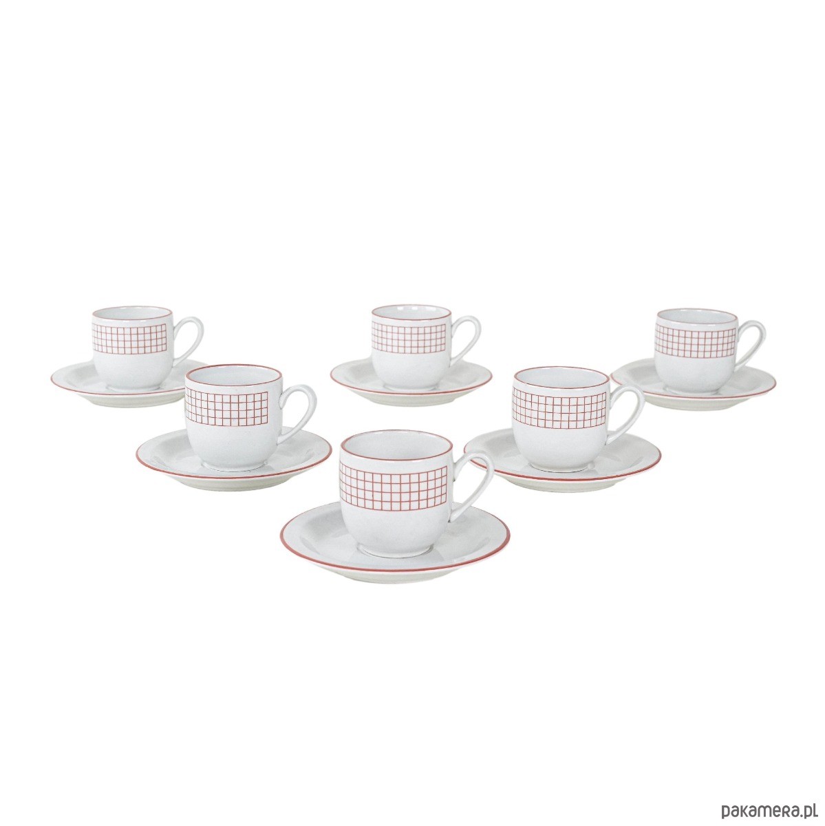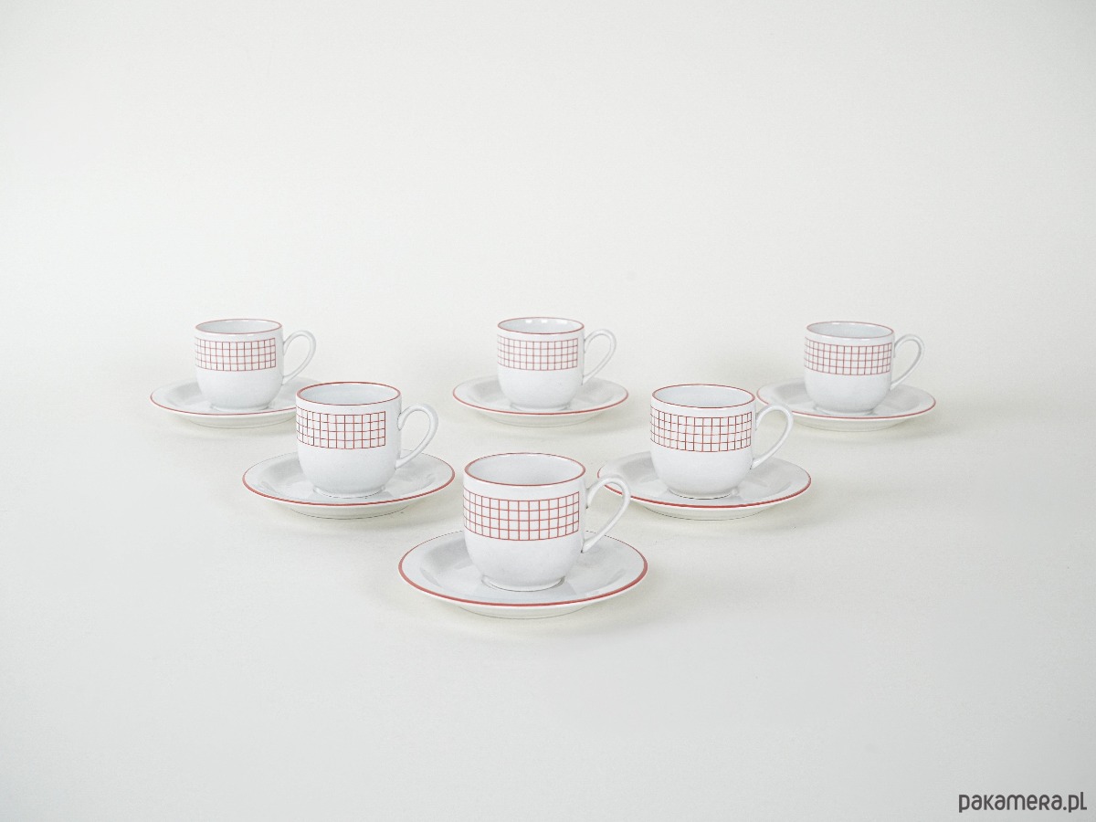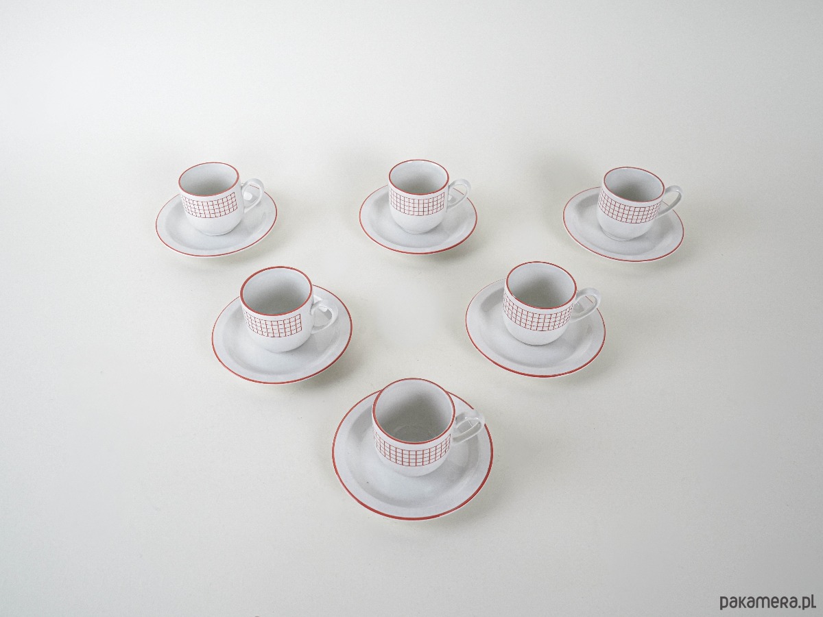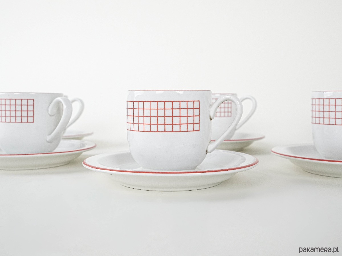 Komplet 6 filiżanek z porcelany w stylu retro, z geometrycznym motywem czerwonej kratki oraz pasującym, czerwonym rantem. Prawdopodobnie produkcja z lat 70.–80. XX wieku, charakterystyczna dla ówczesnych serii kawowych. Minimalistyczny, ale wyrazisty wzór sprawia, że zestaw świetnie wpisze się zarówno w nowoczesne, jak i eklektyczne wnętrza. Idealny do serwowania espresso lub mocnej kawy przy porannym rytuale.