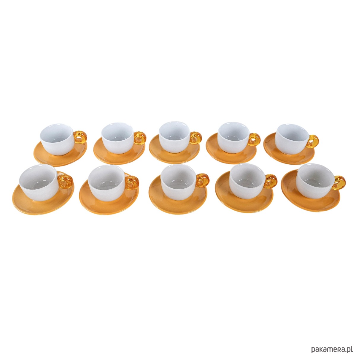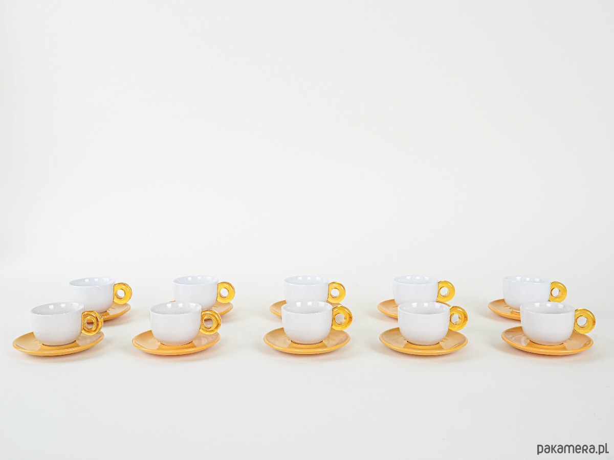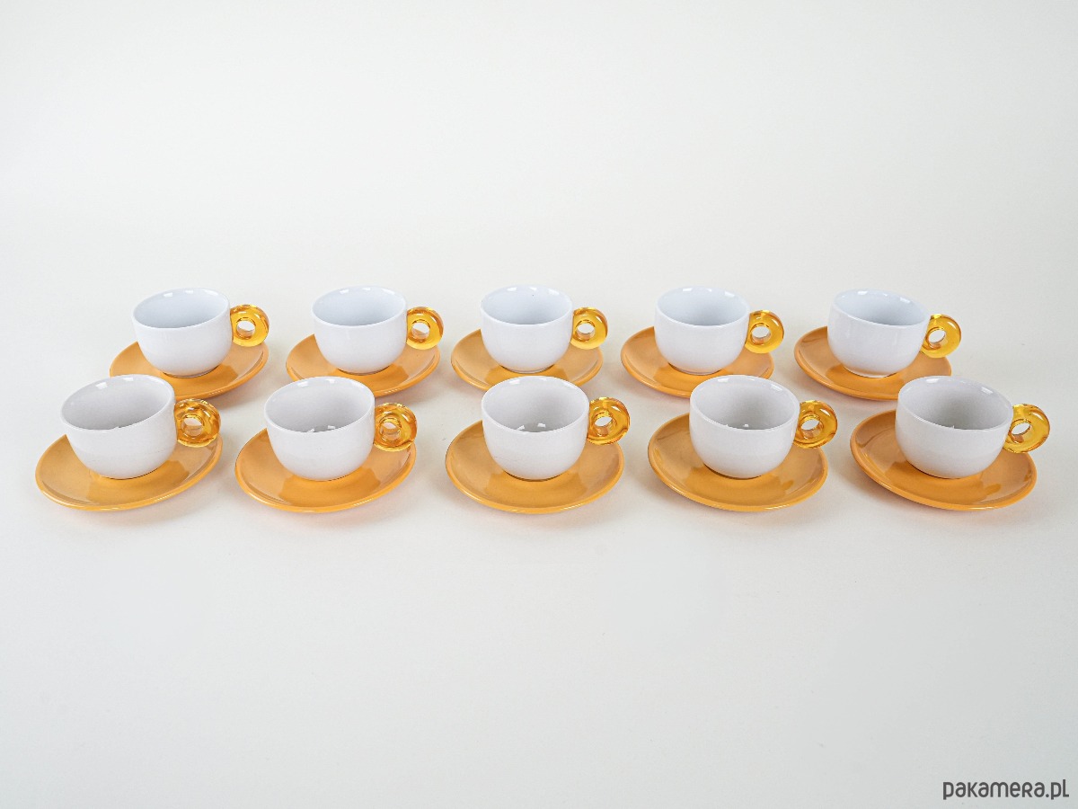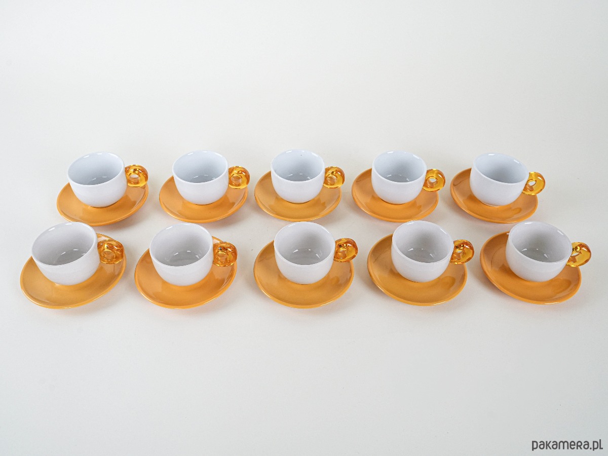 Zestaw 10 filiżanek z talerzykami w energetycznym kolorze, z uchwytami w formie efektownych, transparentnych pierścieni w stylu retro. Wykonane z porcelitu, prawdopodobnie z lat 70.–80. XX wieku, łączą prostotę formy z odważnym, dekoracyjnym detalem. Idealne do serwowania kawy w większym gronie, a także jako wyjątkowy akcent w kolekcji vintage.