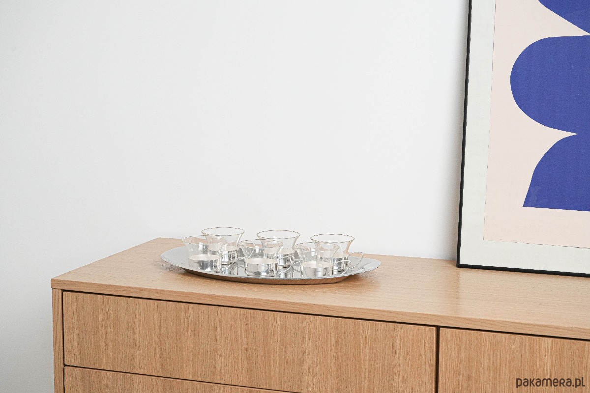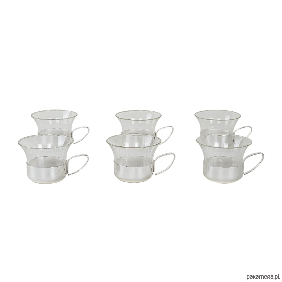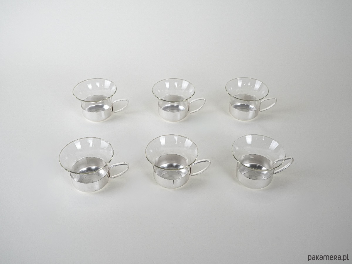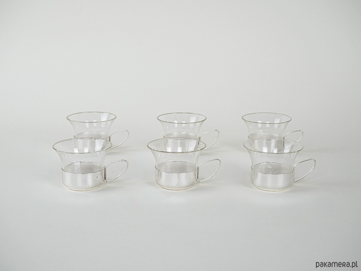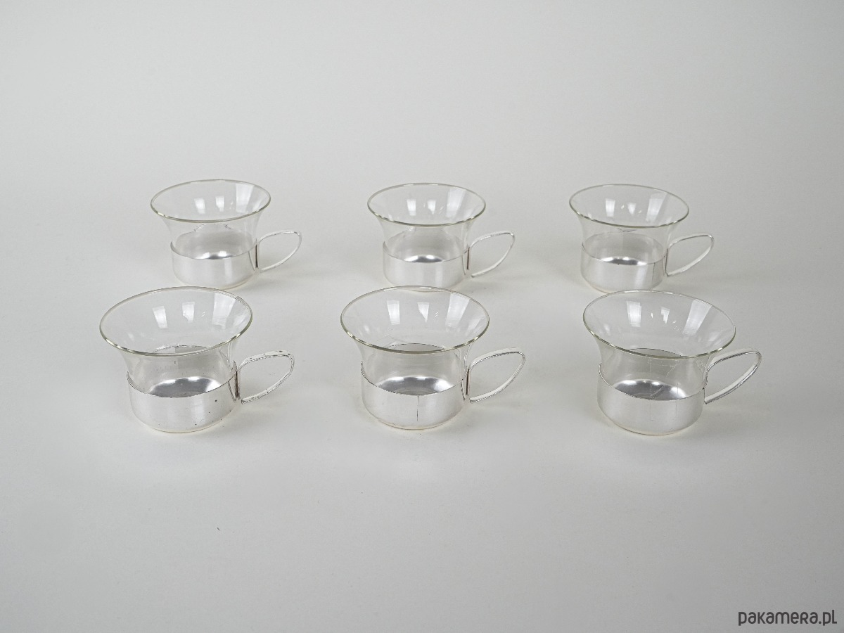 Zestaw 6 filiżanek z przezroczystego szkła osadzonych w srebrzystych, metalowych oprawach z ergonomicznymi uchwytami. Styl modernistyczny, lata 70.–80. XX wieku. Subtelne połączenie szkła i metalu nadaje im elegancji i uniwersalności – idealne zarówno do kawy, jak i herbaty, a także jako efektowny akcent kolekcjonerski. Doskonale komponują się z metalową tacą w podobnym stylu, dostępną w osobnej ofercie.