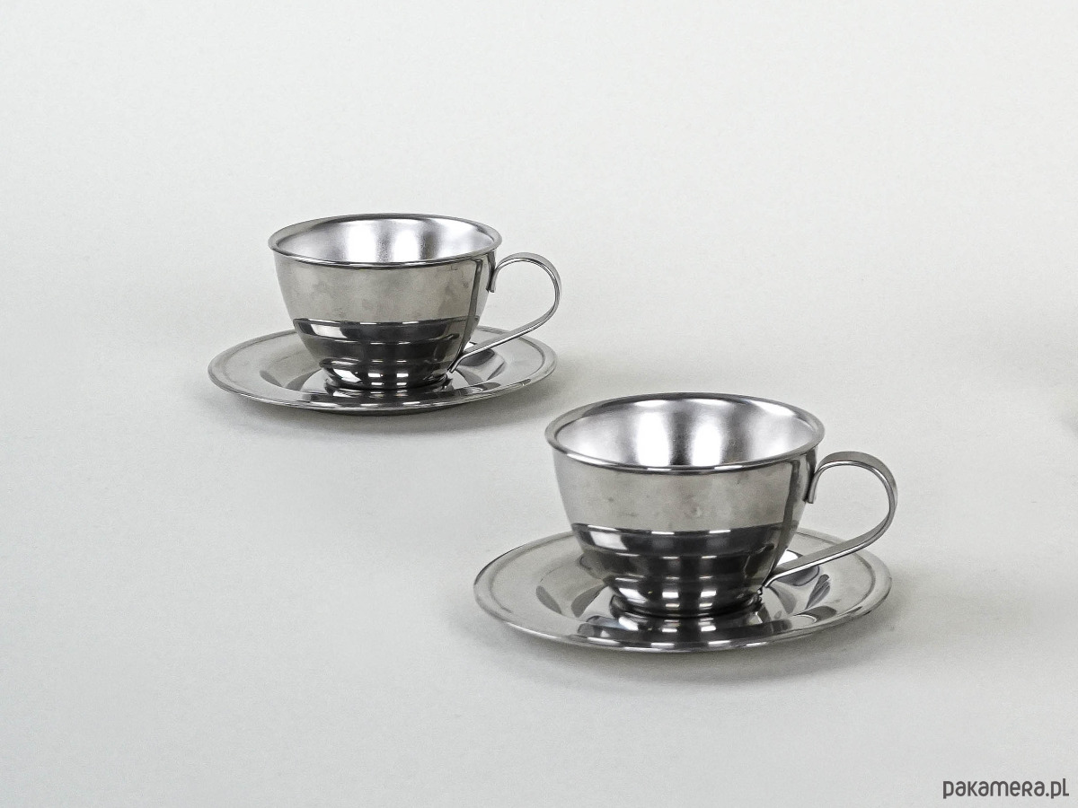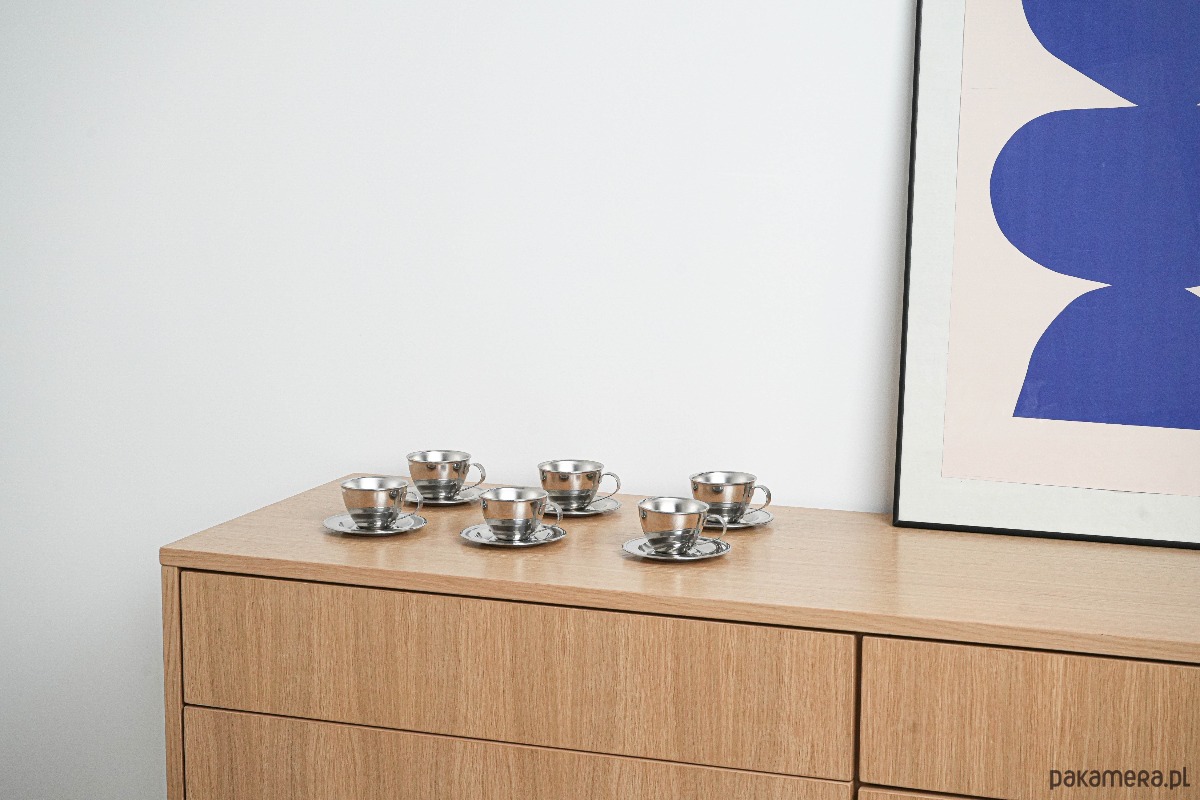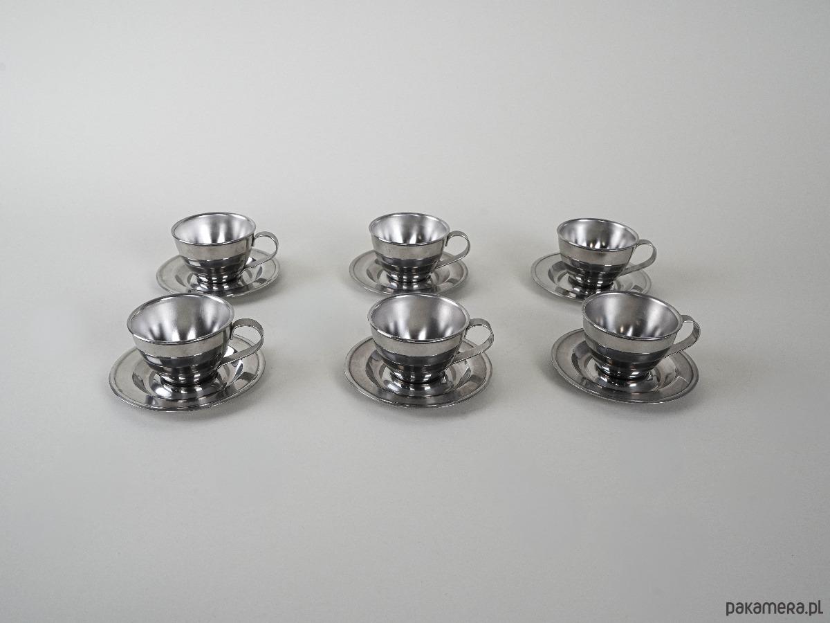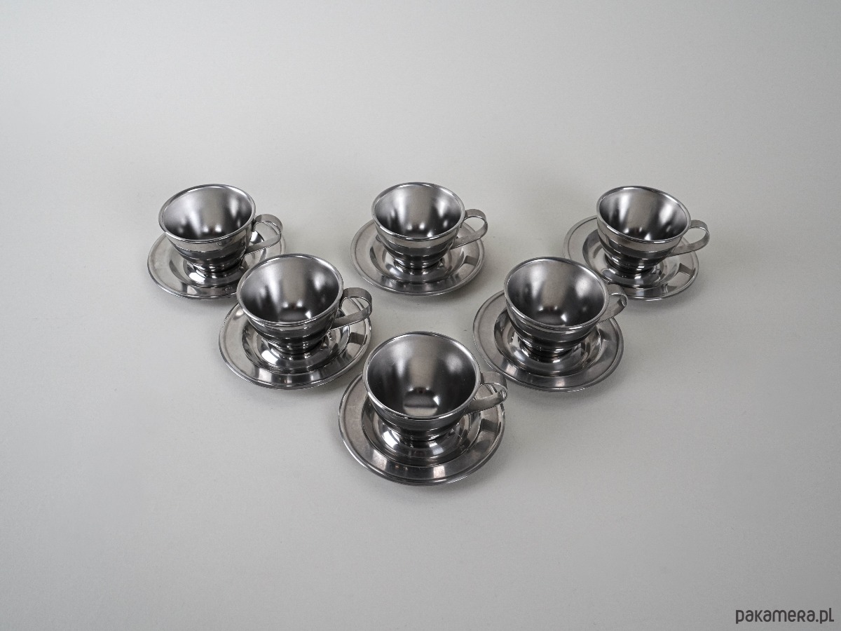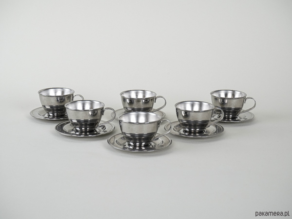 Komplet 6 filiżanek z podstawkami. Wykonany z polerowanej stali nierdzewnej. Prosty, ponadczasowy design w stylu modernistycznym, prawdopodobnie z lat 70.–80. XX wieku. Solidne wykonanie sprawia, że świetnie sprawdzą się zarówno w codziennym użytkowaniu, jak i jako element kolekcji vintage. Idealne dla miłośników minimalistycznych, trwałych form.